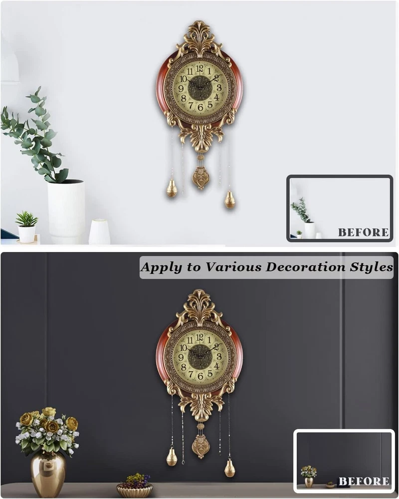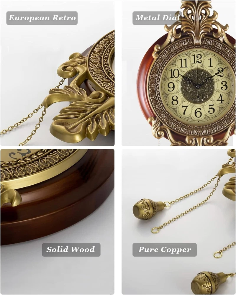 Large Wall Clock with Pendulum, Real Wood Retro Style, Battery Operated, Vintage Royal Decor for Home Living Bedroom DECORATION: You'll Get Many Compliments for This Piece of Art, Elegant and Sturdy, Large Size, Metal Carved Decoration, Finished in Victoria Retro Metal Flower Workmanship with Real Wood Circle to Complement Your Home Decor. MATERIAL: Made of Real Solid Wood and Wrought Iron, Analog Time Display, Swinging Pendulum, Scanning Second hands, Imported Mechanism, Long Lasting SATISFACTION GUARANTEEd Life. Silent, for a Quiet Environment. DIMENSIONS: Dial 14", Top to Bottom without Pendulum ", Top to Bottom with Pendulum 28"; DESIGN: Quartz Movement, Battery Operated. Two-Battery Independent Design, one for time, the other for the pendulum. You can un-install the pendulum battery if the pendulum makes you feel dizzy (For the safety of air transportation, 2*AA Batteries Not Included). satisfaction - 12 s of satisfaction included, please contact me if any question. We Strive to Offer Customers Amazing Service.
