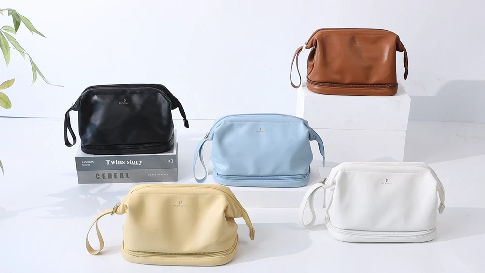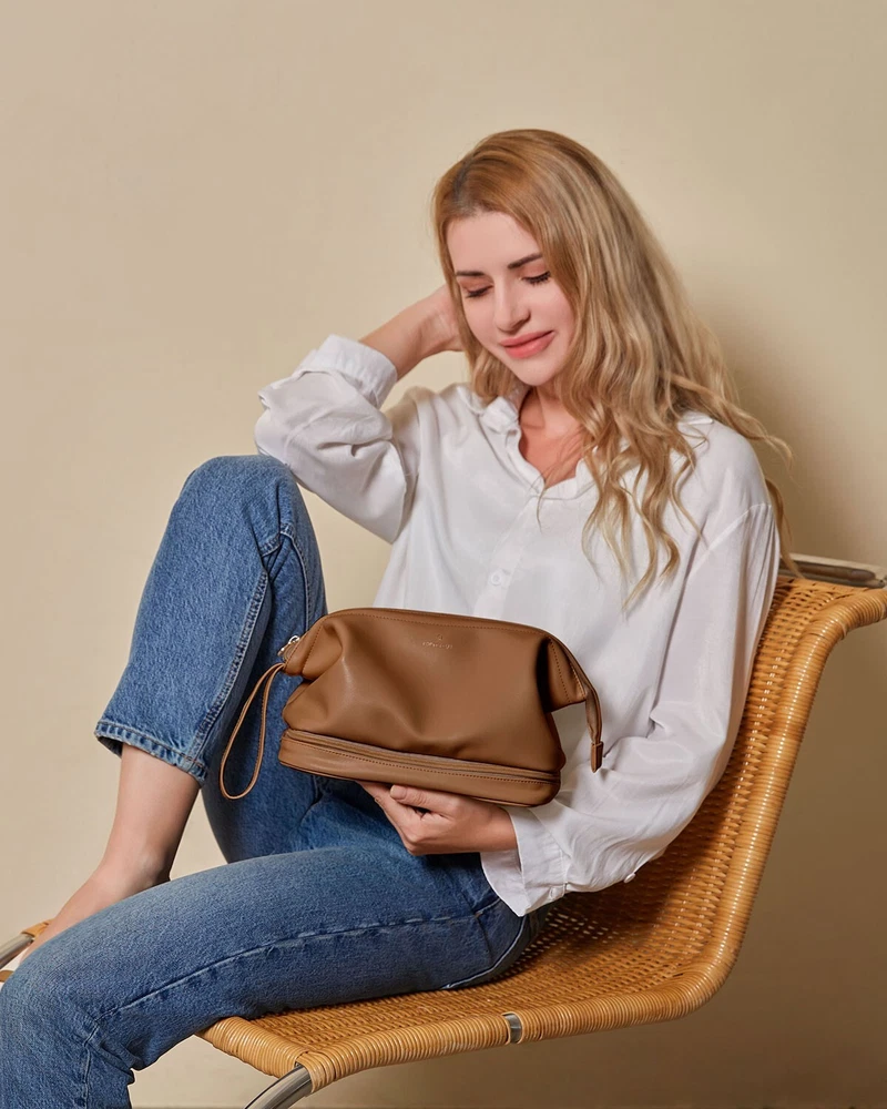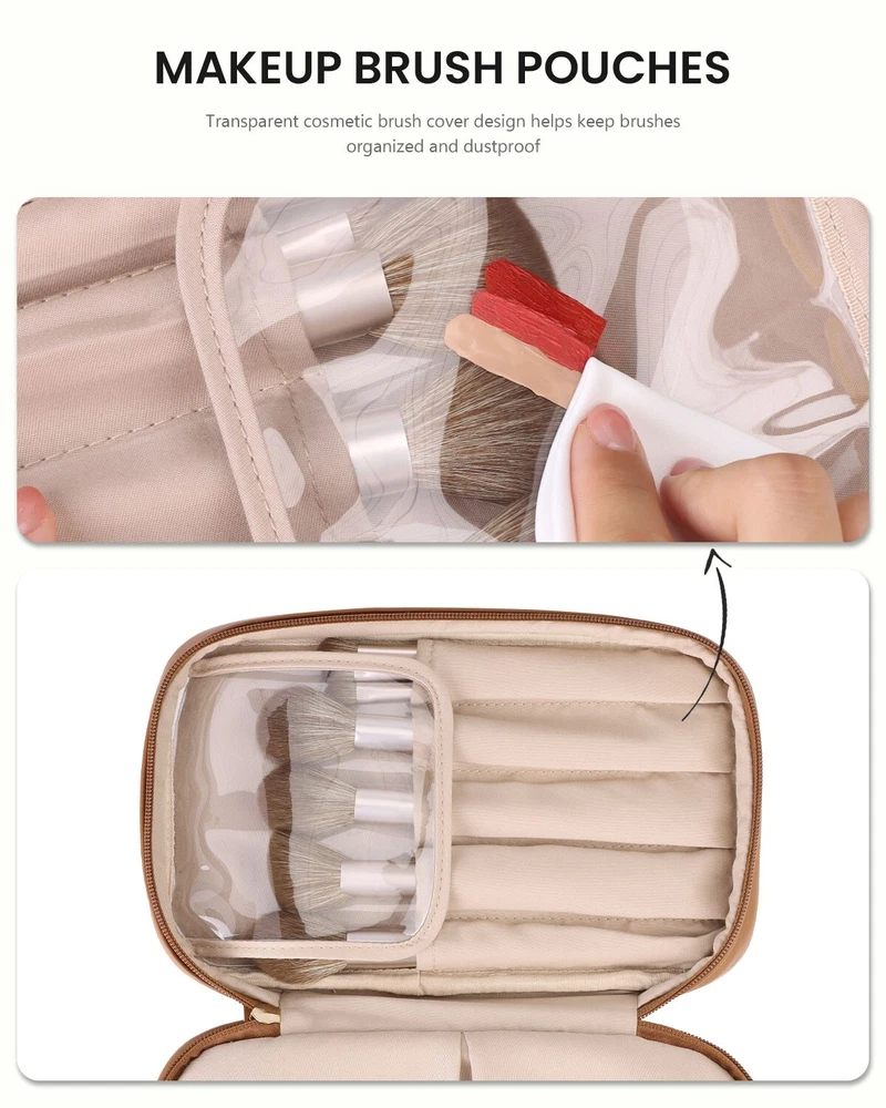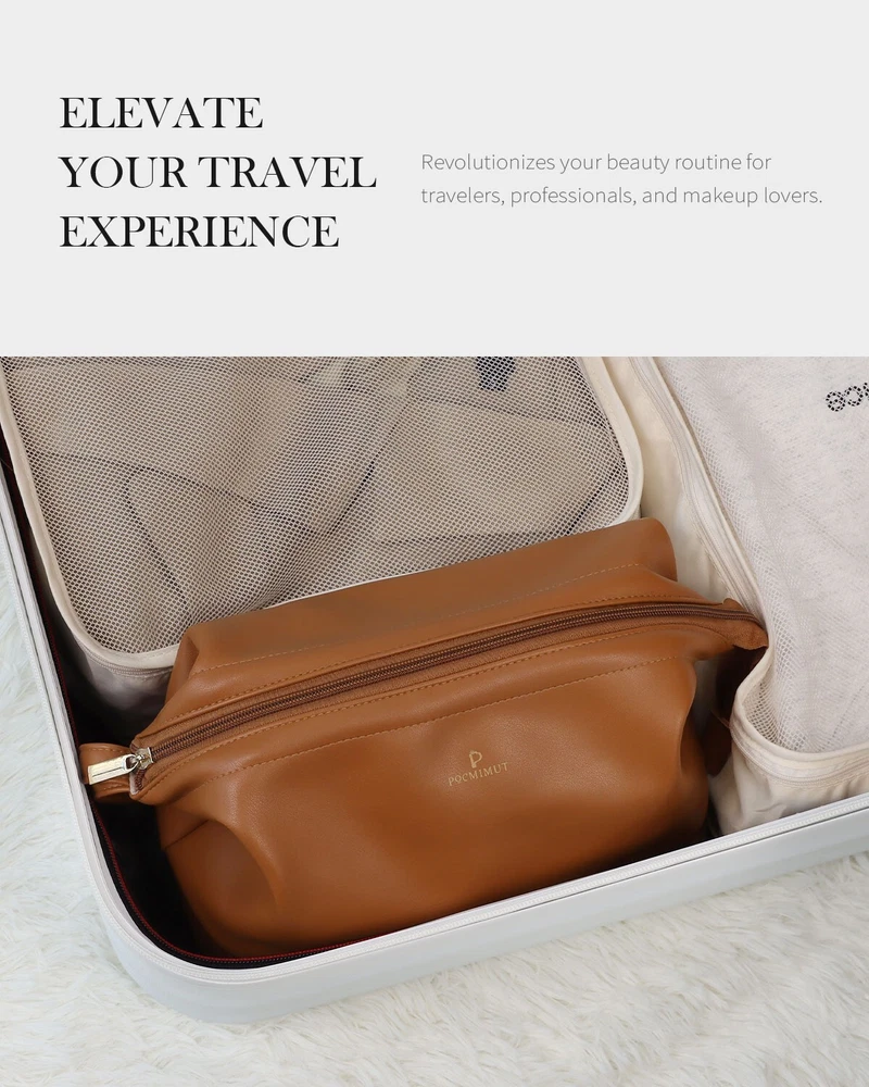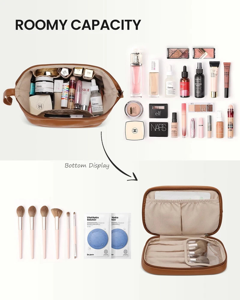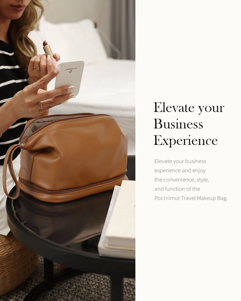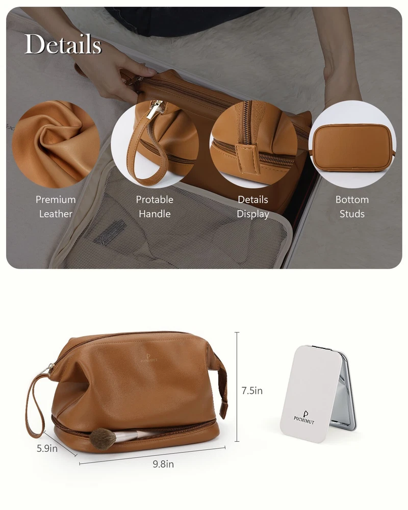 PREMIUM LUXURY LEATHER: Crafted from premium eco-friendly PU leather, Pocmimut makeup bag provides a soft and comfortable texture while being waterproof and easy to clean. And it is also equipped with compact pocket mirror, very suitable to be used in daily life and travel. DOUBLE LAYER MAKEUP BAG: The cosmetic bag is divided into upper and lower storage areas. There are multiple pockets in the main compartment to keep items organized. Separate makeup brush compartment at the bottom, great for protecting brushes from dust. Keep all your travel essentials neatly arranged and easily accessible. CONVENIENT DESIGN: With a wide-open design, this travel make up bag allows for easy organisation and quick access to your beauty essentials, so you can see all your items at a glance and quickly find what you need. ROOMY CAPACITY: Measuring 10.6" x 7.8" x 5.9", the large makeup travel bag offers ample space for all your full-size cosmetics, makeup tools, toiletries or travel essentials, etc. Perfectly sized to fit in suitcases or backpacks, this makeup organizer bag is easy to carry for travel or business trip, suitable for women who are always on the go. MULTI-FUNCTIONAL: Pocmimut leather makeup bag is the perfect choice and ideal companion for any traveller, can serve as a toiletry bag, cosmetic bag, travel accessory bag, skincare bag, electronics bag or daily storage bag. Its elegant design and practicality make it a fantastic gift choice for Christmas, birthdays, or Valentine's Day and more.