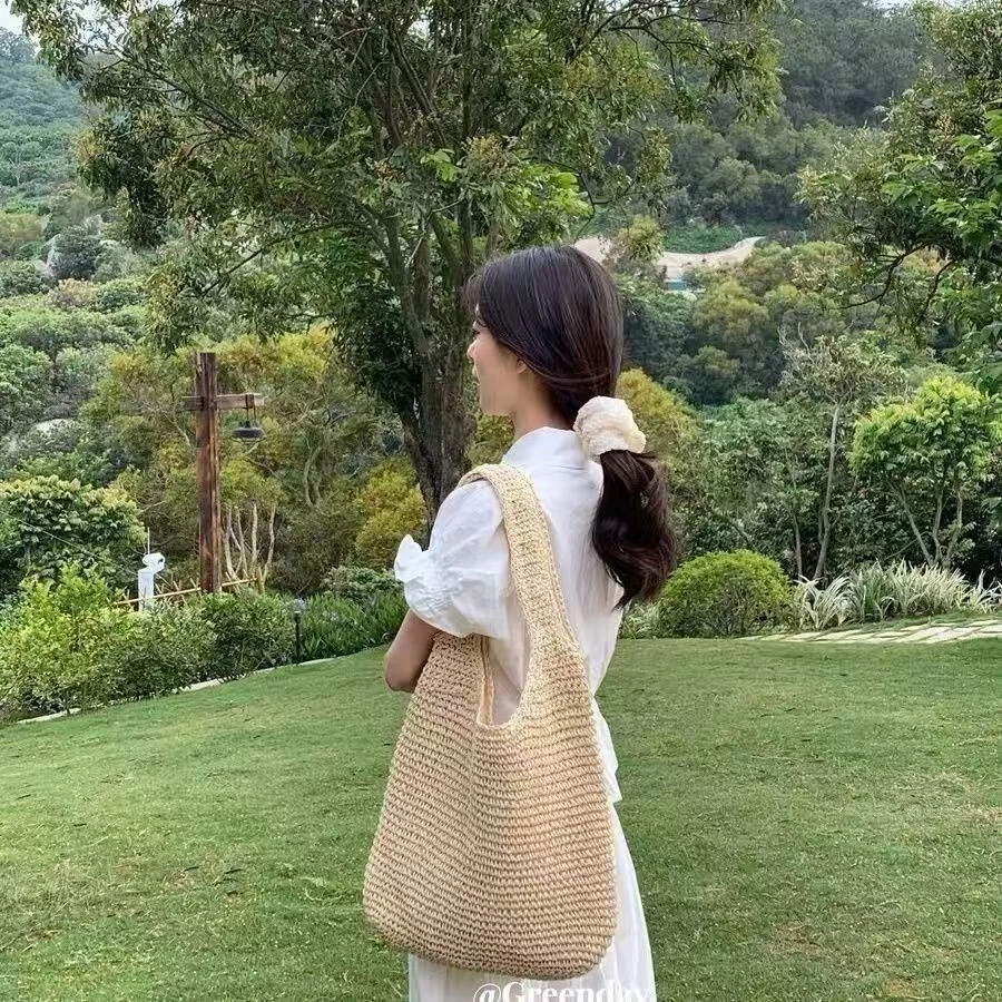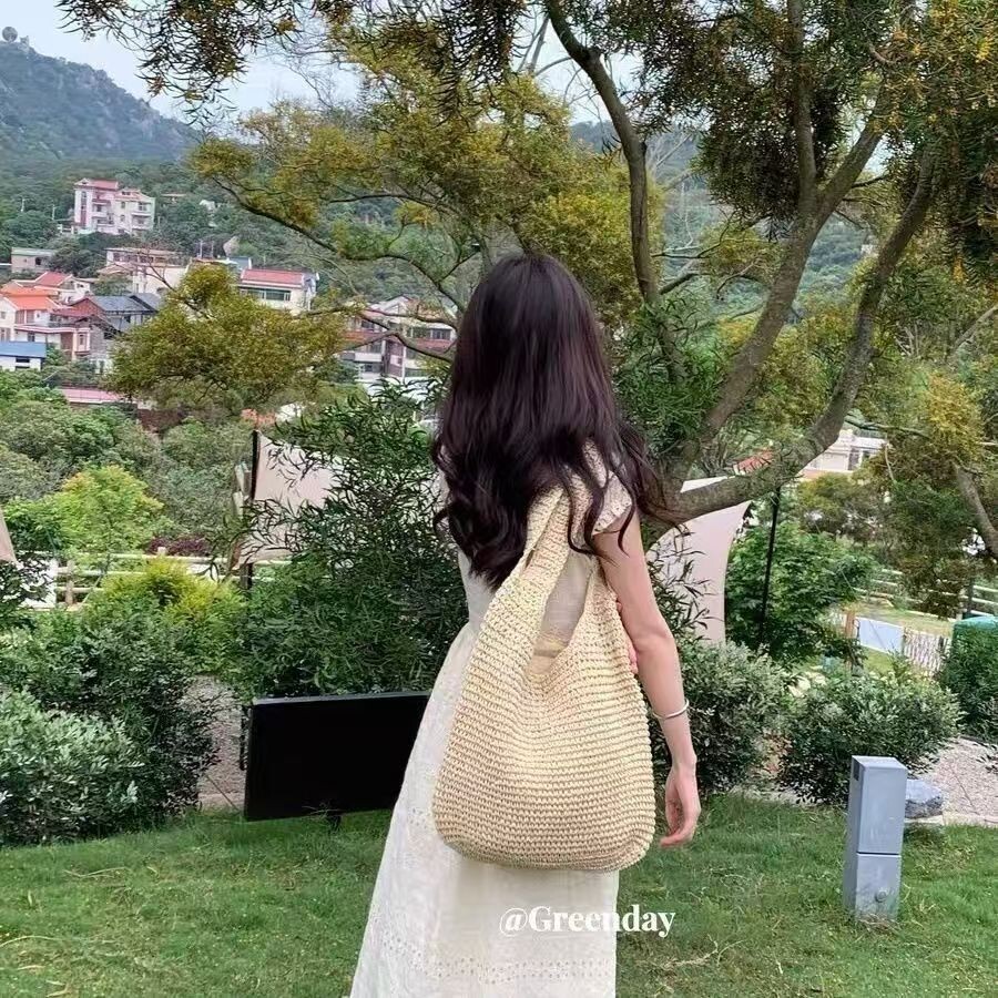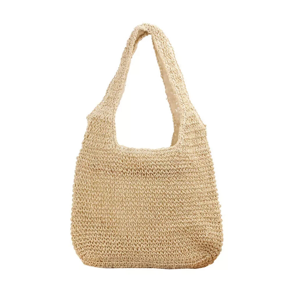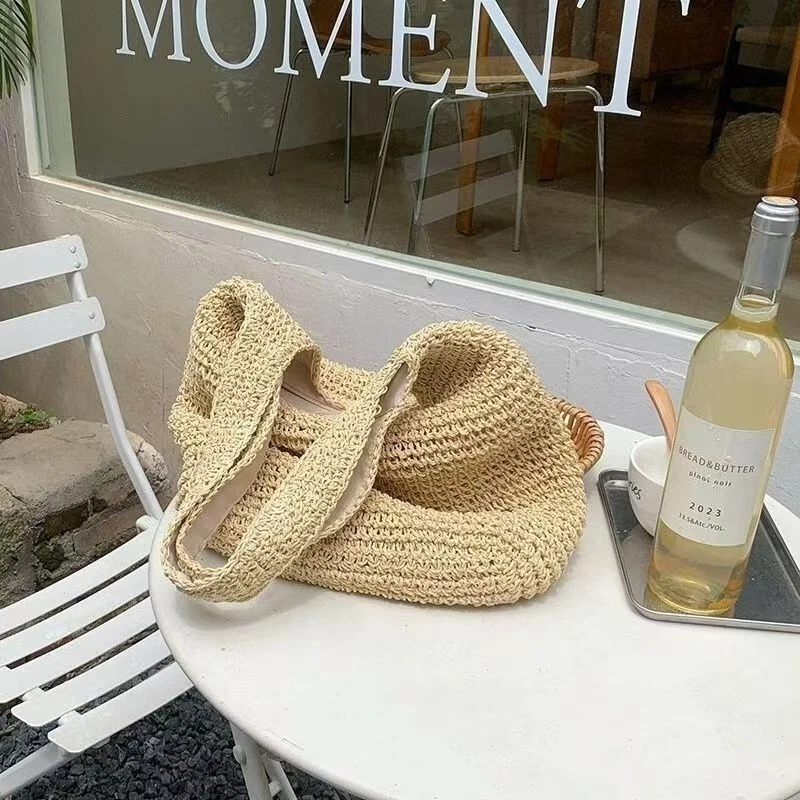 Large Woven Straw Shoulder Bag for Women - Summer Beach Tote with Zipper