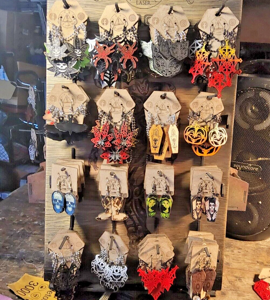 Laser engraved cut coffin demon skull earrings hallowen custom horror fashion Based off a demon skull coffin design i made digitally. Then sent through laser machine. Made on maple. Measures 1.5"h x .75"w x 1/4"d. Loaded with hypoallergenic metal ear hooks. Check out plenty of other lasered creations of mine in shop. Order a few pieces and I'll give you a bundled art deal. Not doing customs at the moment but may be persuaded to fire up the laser for right project. Ebay reselling keeps me busy. Message me to find out. Thanks again for visiting my Ebay shop. ***Treasure Suite offers you many pieces of my art prints now*** ###This section is for laser cut sublimation prints of my digital art. Measurements vary by piece. ### *Welcome to my unique collection of digital art, where creativity meets craftsmanship! Each piece in this category features my original digital designs, heat pressed into vibrant sublimation prints on laser cut whiteboard material. Some are engraved then hand painted. These art pieces are not just decorations, they are collectibles that bring a touch of gothic, rock and roll, horror, pin-up, and lowbrow art into your space. *perfect for:* *man cave *castle *bungalow *abode *domicile *penthouse *flat *cabin *studio *boutique hotel *yacht *etc *These pieces make fantastic gifts for art enthusiasts and collectors alike. Who doesn't enjoy vibrant digital art of out of this world space huntresses, demon witches, cyberpunk vixen cyborgs, spooky mistresses, hearses, hotrods, and so on? ***May consider custom orders of laser cut or engraved items.***