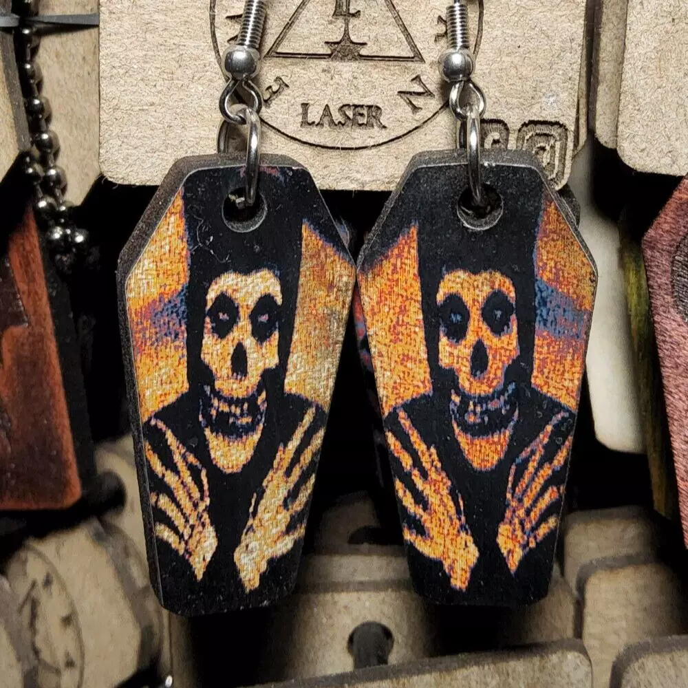 Laser engraved cut coffin misfits earrings hallowen custom punk horror fashion art goth metal rockabilly Based off a misfits crimson ghost design i made digitally. Then sent through laser machine. Made on plywood. From skull bead to bottom of earring measures 1.5"h x .75"w x 1/4"d. Loaded with hypoallergenic metal ear hooks. Check out plenty of other lasered creations of mine in shop. Order a few pieces and I'll give you a bundled art deal. Not doing customs at the moment but may be persuaded to fire up the laser for right project. Ebay reselling keeps me busy. Message me to find out. Thanks again for visiting my Ebay shop. ***Treasure Suite offers you many pieces of my art prints now*** ###This section is for laser cut sublimation prints of my digital art. Measurements vary by piece. ### *Welcome to my unique collection of digital art, where creativity meets craftsmanship! Each piece in this category features my original digital designs, heat pressed into vibrant sublimation prints on laser cut whiteboard material. Some are engraved then hand painted. These art pieces are not just decorations, they are collectibles that bring a touch of gothic, rock and roll, horror, pin-up, and lowbrow art into your space. *perfect for:* *man cave *castle *bungalow *abode *domicile *penthouse *flat *cabin *studio *boutique hotel *yacht *etc *These pieces make fantastic gifts for art enthusiasts and collectors alike. Who doesn't enjoy vibrant digital art of out of this world space huntresses, demon witches, cyberpunk vixen cyborgs, spooky mistresses, hearses, hotrods, and so on? ***May consider custom orders of laser cut or engraved items.***