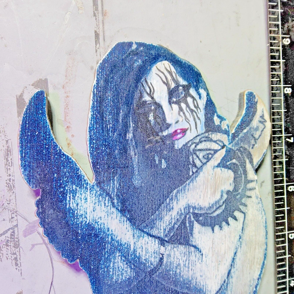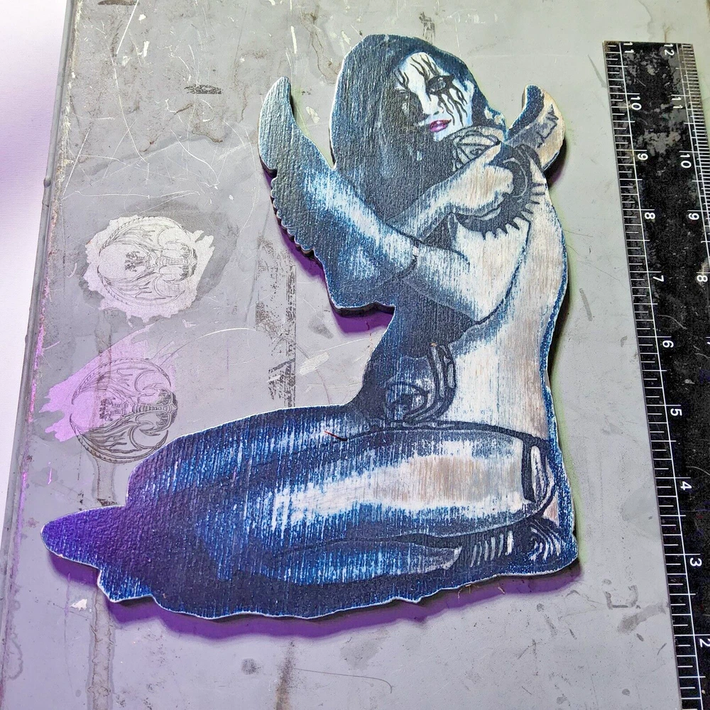 Laser engraved cut pinup girl with knives wooden digital art print magnet 8.5x7.5 by me I drew this up around 2010 but the magic of lasers made this possible. Now that i look at her, she does resemble Lady Gaga as Harley Quinn. Weiiiiird. I have others listed here too. Magnetized. This is the only black metal one. Looks cool under uv light. Quite a bit of work goes into making my laser cut/engraved art. I come up with most of art/shapes,draw them out,edit colors,sizes, transfer files to multiple formats,paint,assemble,etc. Lots of steps to get some fine off the wall pieces. From tablet,to you. Can give bundle deal for multiple pieces. Not entertaining custom orders at this moment. ***Treasure Suite offers you many pieces of my art prints now*** ###This section is for laser cut sublimation prints of my digital art. Measurements vary by piece. ### *Welcome to my unique collection of digital art, where creativity meets craftsmanship! Each piece in this category features my original digital designs, heat pressed into vibrant sublimation prints on laser cut whiteboard material. Some are engraved then hand painted. These art pieces are not just decorations, they are collectibles that bring a touch of gothic, rock and roll, horror, pin-up, and lowbrow art into your space. *perfect for:* *man cave *castle *bungalow *abode *domicile *penthouse *flat *cabin *studio *boutique hotel *yacht *etc *These pieces make fantastic gifts for art enthusiasts and collectors alike. Who doesn't enjoy vibrant digital art of out of this world space huntresses, demon witches, cyberpunk vixen cyborgs, spooky mistresses, hearses, hotrods, and so on? ***May consider custom orders of laser cut or engraved items.***