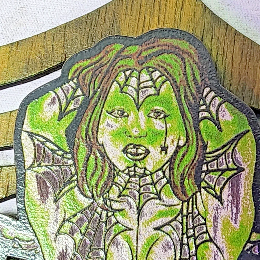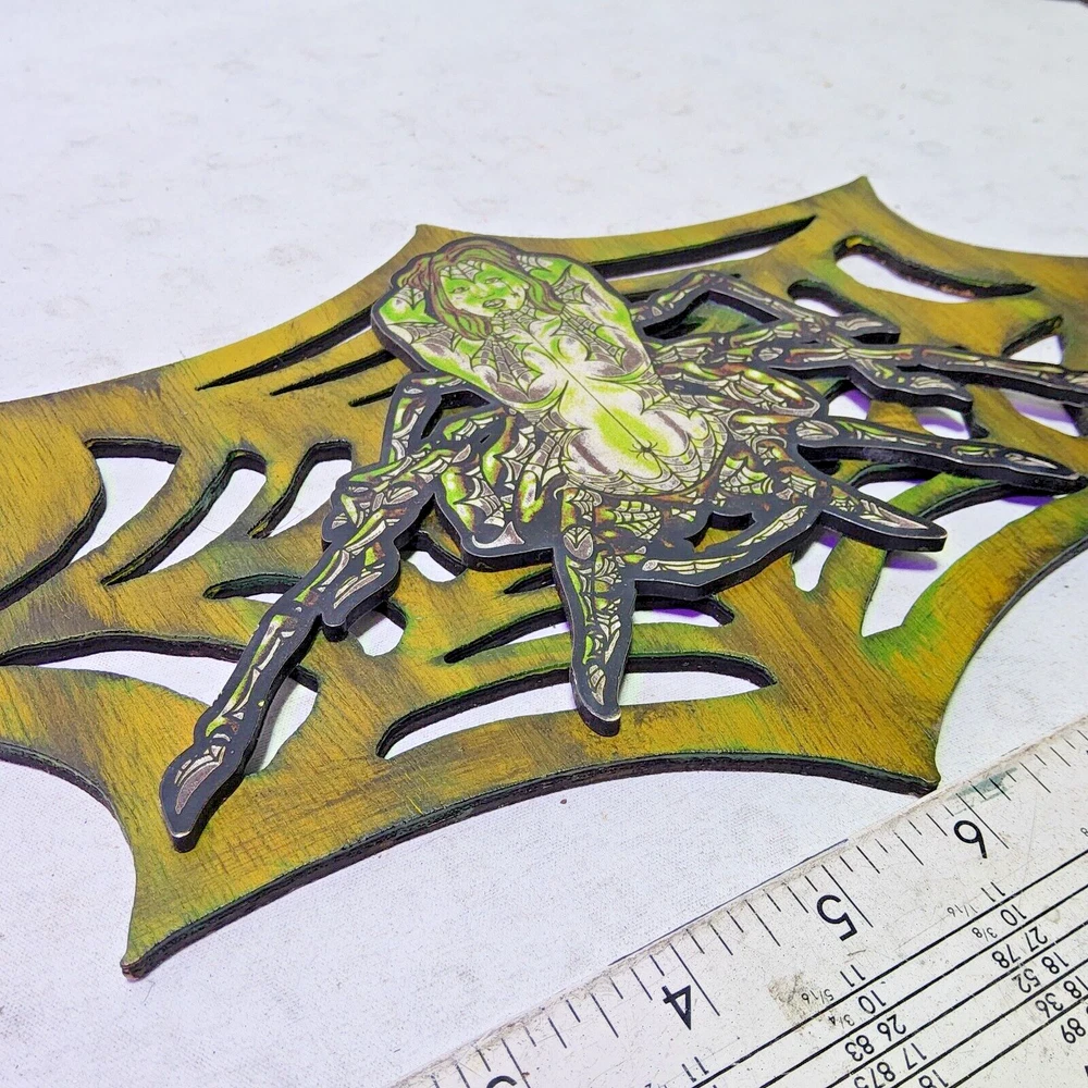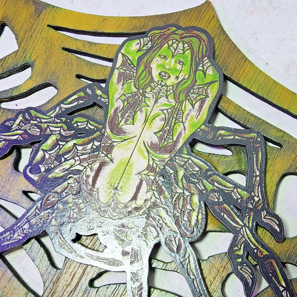 Laser engraved cut spider queen on web digital plywood pinup art 12x7 goth decor horror sci-fi fantasy fiction cryptid Based off my digital art of an alluring spider/woman hybrid queen art. Notice spider hanging from web as her teardrop. I have a large detailed sublimation laser cut print here minus the web. Please check it out. Quite a bit of work goes into making my laser cut/engraved art. I come up with most of art/shapes,draw them out,edit colors,sizes, transfer files to multiple formats,paint,assemble,etc. Lots of steps to get some fine off the wall pieces. From tablet,to you. Can give bundle deal for multiple pieces. Not entertaining custom pieces at this moment. ***Treasure Suite offers you many pieces of my art prints now*** ###This section is for laser cut sublimation prints of my digital art. Measurements vary by piece. ### *Welcome to my unique collection of digital art, where creativity meets craftsmanship! Each piece in this category features my original digital designs, heat pressed into vibrant sublimation prints on laser cut whiteboard material. Some are engraved then hand painted. These art pieces are not just decorations, they are collectibles that bring a touch of gothic, rock and roll, horror, pin-up, and lowbrow art into your space. *perfect for:* *man cave *castle *bungalow *abode *domicile *penthouse *flat *cabin *studio *boutique hotel *yacht *etc *These pieces make fantastic gifts for art enthusiasts and collectors alike. Who doesn't enjoy vibrant digital art of out of this world space huntresses, demon witches, cyberpunk vixen cyborgs, spooky mistresses, hearses, hotrods, and so on? ***May consider custom orders of laser cut or engraved items.***