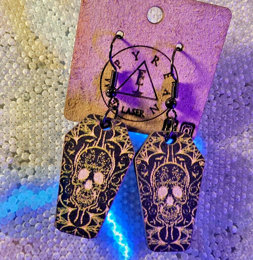 Laser engraved cut sugar skull themed earrings hallowen custom art horror fashion green and black western coffin Made from one of my sugarskull coffin designs on laser cutter/engraver. Measures 1.5"h x .75"w x 1/4"d. Loaded with hypoallergenic metal ear hooks. Check out plenty of other lasered creations of mine in shop. Order a few pieces and I'll give you a bundled art deal. Not doing customs at the moment but may be persuaded to fire up the laser for right project. Ebay reselling keeps me busy. Message me to find out. Thanks again for visiting my Ebay shop. ***Treasure Suite offers you many pieces of my art prints now*** ###This section is for laser cut sublimation prints of my digital art. Measurements vary by piece. ### *Welcome to my unique collection of digital art, where creativity meets craftsmanship! Each piece in this category features my original digital designs, heat pressed into vibrant sublimation prints on laser cut whiteboard material. Some are engraved then hand painted. These art pieces are not just decorations, they are collectibles that bring a touch of gothic, rock and roll, horror, pin-up, and lowbrow art into your space. *perfect for:* *man cave *castle *bungalow *abode *domicile *penthouse *flat *cabin *studio *boutique hotel *yacht *etc *These pieces make fantastic gifts for art enthusiasts and collectors alike. Who doesn't enjoy vibrant digital art of out of this world space huntresses, demon witches, cyberpunk vixen cyborgs, spooky mistresses, hearses, hotrods, and so on? ***May consider custom orders of laser cut or engraved items.***