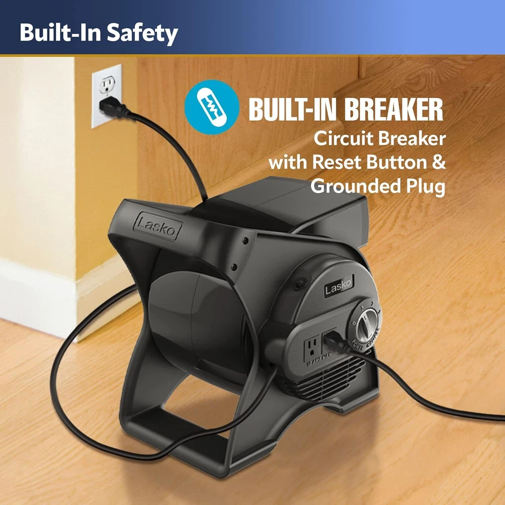 ✅【HIGH VELOCITY AIR STREAM】Powered by 3 fan speeds, this pivoting air mover generates maximum air delivery of approximately 289 CFMs and is best for cooling the hottest spaces in the house, circulating and exhausting stuffy air, and drying out wet carpeting and floors ✅【FUNCTIONAL DESIGN】With it's rugged construction, this pivoting blower fan is Ideal for kitchens, garages, workshops, basements, and more; the lightweight design (7.5 lbs.) and large carry handle make it easy to move this fan from room to room ✅【CONVENIENT FFEATURES】This powerful utility blower fan features two 120-volt grounded outlets for accessory use; the patented 270-degree pivoting action allows you to direct the airflow right where you need it--from circulating air at floor level to exhausting the air from a newly-painted room and anywhere in-between. ✅【SPACE SAVING DESIGN】With an 12.19” x 9.63” footprint, and standing only 12.25 inches tall, this fan easily fits in small spaces and 10-foot power cord and large easy grip handle make it easy to place where air circulation is needed. ✅【BUILT IN SAFETY】The Lasko Pivot Pro pivoting fan is ETL Listed and comes with a circuit breaker and reset button; the 10 foot cord with 3-prong grounded plug makes it a safe choice for a cooling breeze ✅【BUILT FOR POWER】This floor fan features a 120-volt design at .77/1.0 AMPs, 92/100 watts, and 251/289 CFMs on low/high