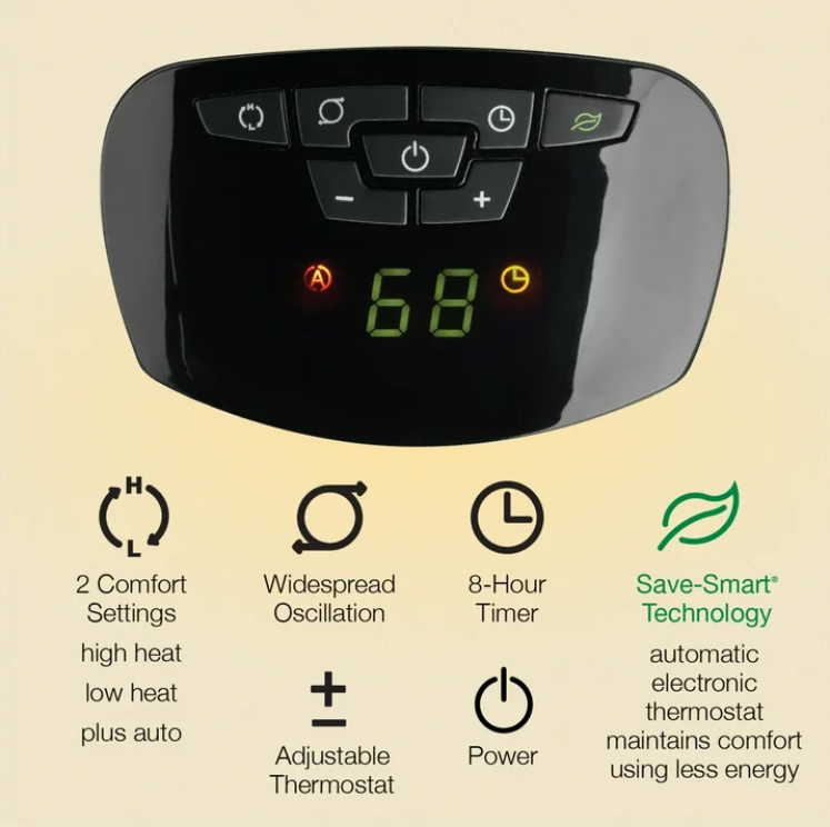 Product details The Lasko Ceramic Electric Tower Space Heater features 1500W of comforting warmth and an elongated heating element, which extends your comfort zone. Features easy-to-use electronic touch control operation, plus a multi-function remote control for convenience. This powerful space heater has two heat settings: high heat, low heat, plus an auto thermostat mode. The auto-off timer can be set for up to 8 hours. It has a convenient carry handle for room-to-room mobility and comes fully assembled. This dependable Lasko Tower Heater with digital display will be sure to keep you warm and toasty. This electric heater is ETL listed and Includes built-in safety features such as overheat protection, a cool-touch exterior and a safe ceramic element. 3-year limited warranty. Comes with a 6-foot power cord. For your safety, do not use space heaters with extension cords. For indoor use only. For indoor use only. Condition: New Provides 1500 watts of comforting warmth with an elongated heating element Features powerful air velocity to push heat throughout the room Simple electronic controls with an easy to read digital display Two heat settings: high heat, low heat 8-hour auto-off timer Widespread oscillation for full room coverage Adjustable thermostat maintains preferred temperature setting Molded carry handle for easy portability from room to room Comes fully assembled Built-in safety features include overheat protection, a cool-touch exterior and a safe ceramic element