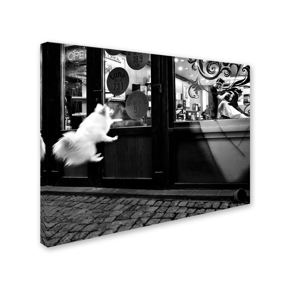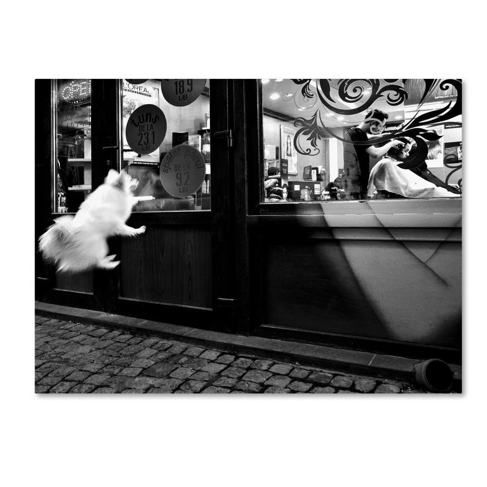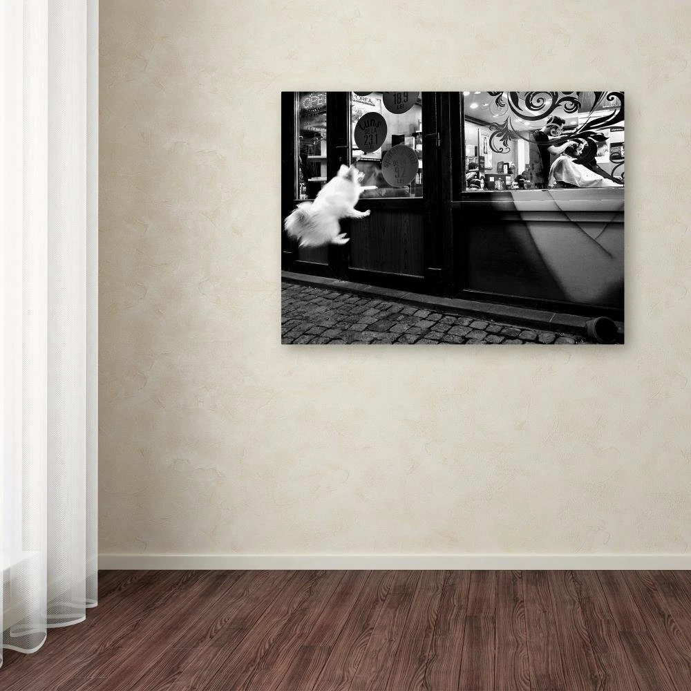 This ready to hang, gallery-wrapped art piece features a small dog jumping outside of a building looking in. 1x is not your average photo site. All photos on 1x are selected by a team of professional gallery curators, just like in a real photo gallery. Our curators have experience from well-known institutions such as Sothebyi1/2s and Tate Modern Art. We believe that everyone has an inner photographer, just waiting to be discovered. Getting published on 1x is a great achievement; many photographers whose works now hang in art galleries were once discovered on 1x. Iti1/2s no coincidence that art directors, book editors, and magazines all over the world use photos from 1x photographers. Giclee (jee-clay) is an advanced printmaking process for creating high quality fine art reproductions. The attainable excellence that Giclee printmaking affords makes the reproduction virtually indistinguishable from the original piece. The result is wide acceptance of Giclee by galleries, museums, and private collectors. Gallery wrap is a method of stretching an artist's canvas so that the canvas wraps around the sides and is secured a , wooden frame. This method of stretching and preparing a canvas allows for a frameless presentation of the finished painting. Artist: Mirela Momanu Subject: Animals Style: modern & Contemporary Product Type: Gallery-Wrapped canvas art Made in USA
