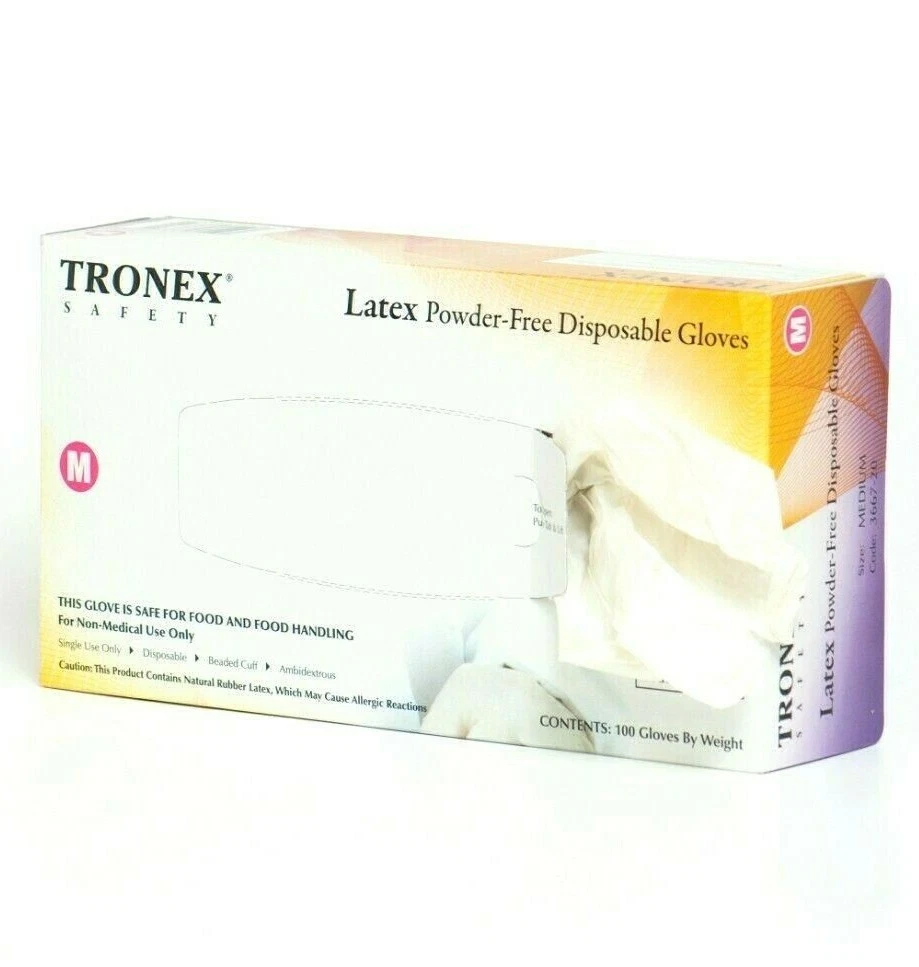 Tronex Brand - Top Quality Disposable, Latex Powder Free Gloves in Size Medium. In stock and ready to ship today Ground with free delivery. 100 gloves/box Our exceptionally durable latex gloves are manufactured from the highest quality virgin latex to provide outstanding comfort, protection, tactile sensitivity, dexterity, and good resistance to tears and punctures, while offering a true second-skin-like touch and feel Powder Free Latex gloves; sold in size Medium. Natural color 100 gloves/box Exam Grade; 4 Mil thickness Fully textured for sustained grip during use Superior elasticity, tactile sensitivity, and tear resistance Ambidextrous with beaded cuffs An excellent choice for food processing, general maintenance, and janitorial use Designed to meet or exceed all industry standards for safety and quality