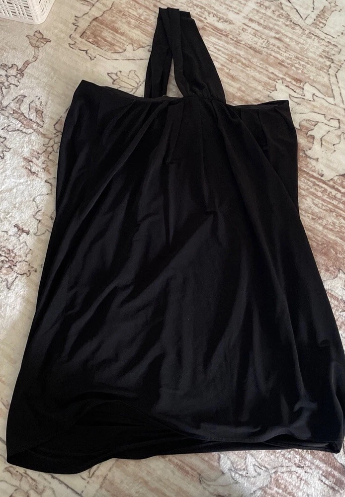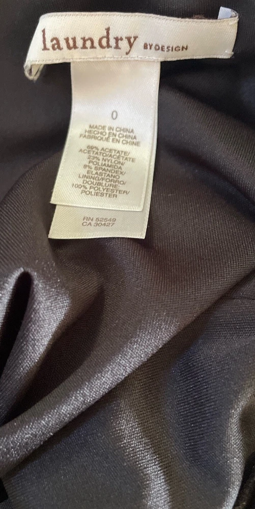 This Laundry by Design black mini dress is a stunning addition to any wardrobe. The one shoulder neckline and asymmetrical sleeve add a touch of elegance, while the pullover closure and stretchy spandex material make it comfortable to wear. Perfect for a variety of occasions, from weddings to casual outings, this dress is sure to turn heads. The dress is lined and made from a jersey fabric, which gives it a smooth and polished look. It's a classic designer piece that will never go out of style, and it comes in a size 0 which is perfect for some women. The dress is easy to care for, as it should be hand washed only. It's a must-have for any fashion-forward woman who wants to look her best. Good condition No stains or tears Brand tag is loose as shown in photo 15”pit to pit 25” pit to hem