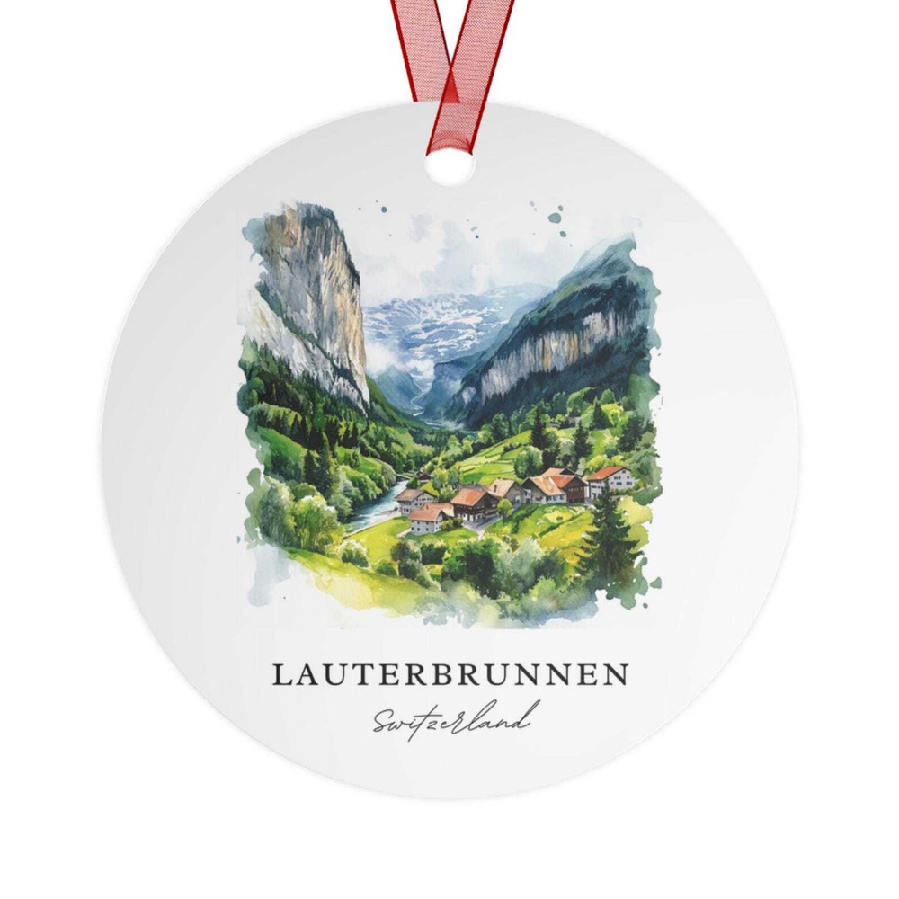 Lauterbrunnen Ornament Unique Lauterbrunnen Souvenir Switzerland Xmas Decor And Authentic Lauterbrunnen Gift Material: Ceramic Color: White Shapes: Circle, star, heart and oval Can be printed on both sides Imprint full-color artwork, photos, or logos Hole for hanging string and hanging string included Printed in the USA