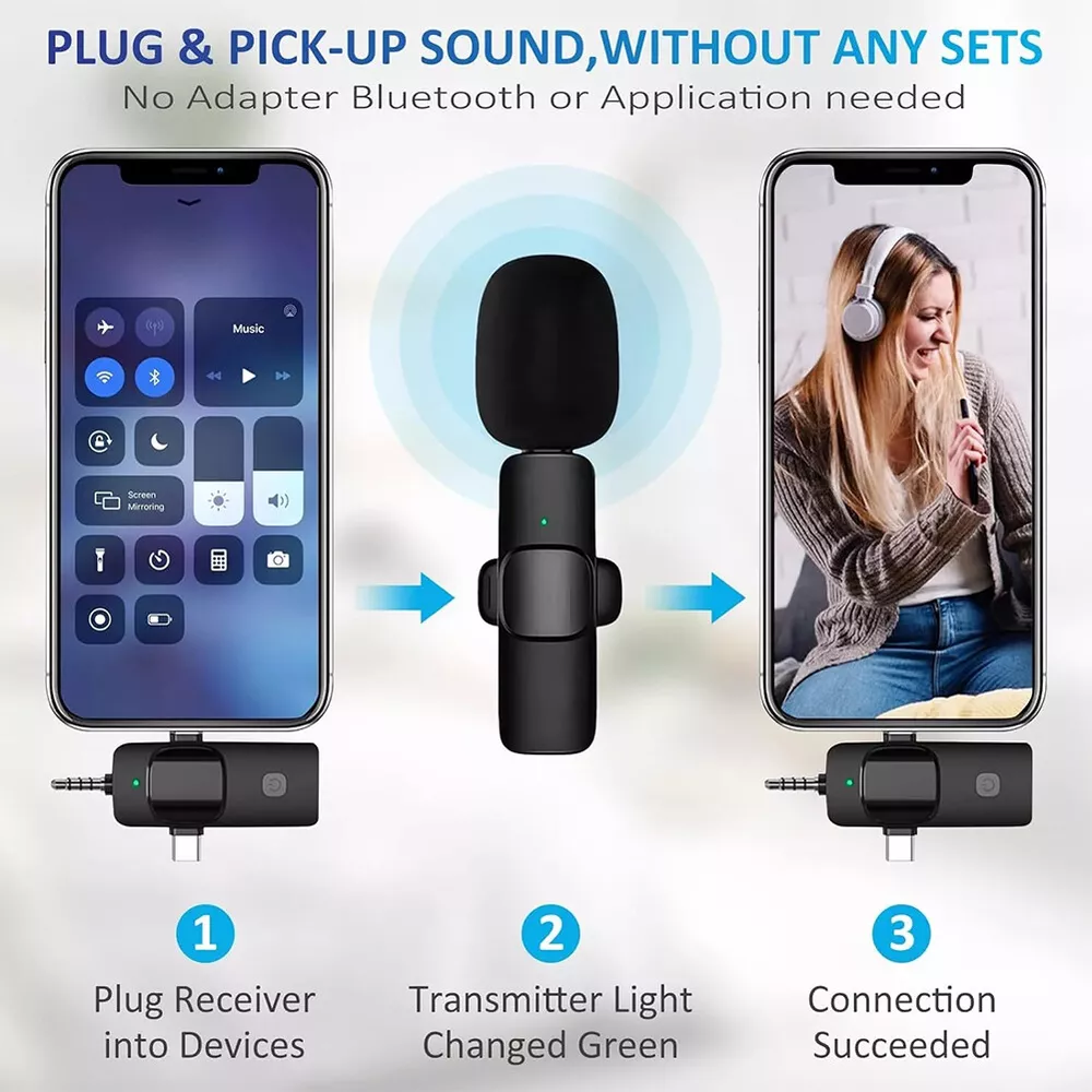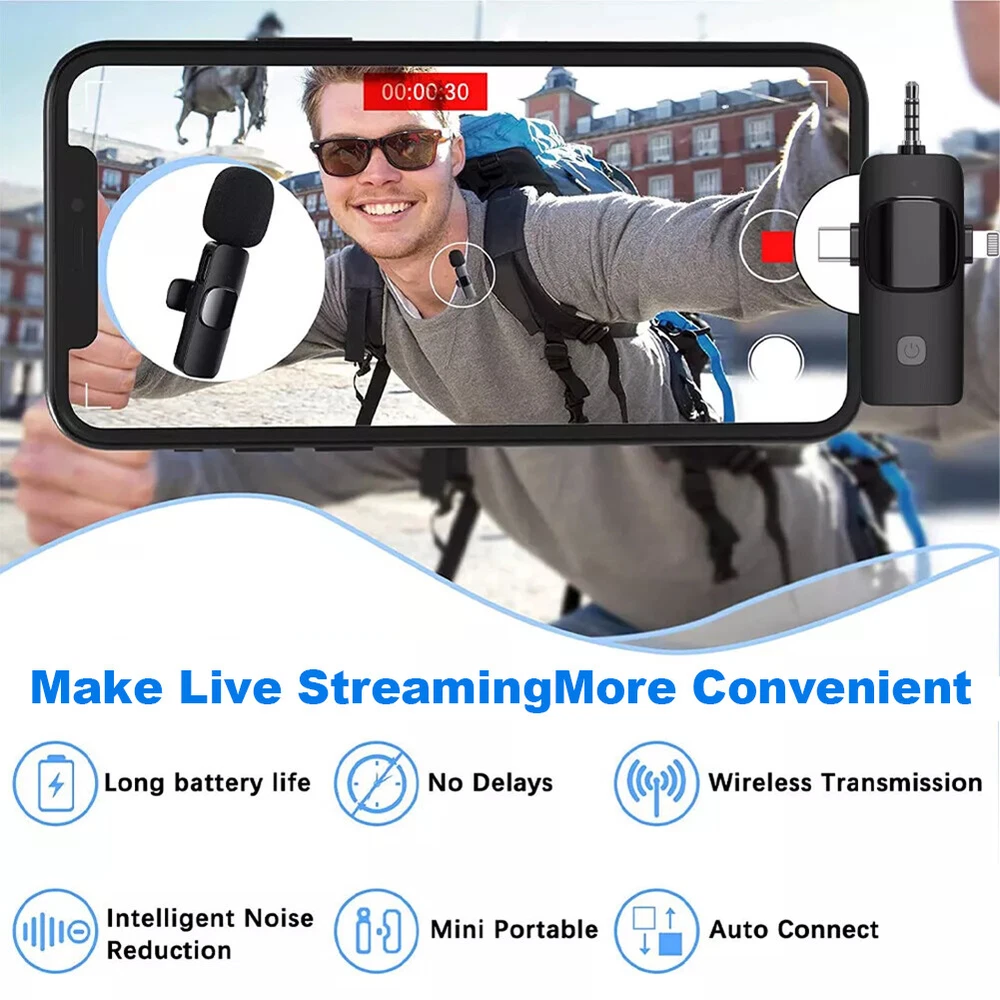 For Samsung Galaxy S23 Ultra 5G S Pen Stylus Black SPen Replacement SM-S918 13.39 USD Free shipping 100PCS Magnetic Building Blocks Toddler Build Mine Magnet World Set 44.99 USD Free shipping 1-10pcs Finger Flush Pulls for Closet Pocket Sliding Barn Door Handle Set 8.29 USD Free shipping 435Pcs Glow In The Dark Luminous Stars Moon Planet Space Kid Wall Stickers Decal 10.99 USD Free shipping 1-4 Pack GPS Tracker Wireless Bluetooth Anti-Lost Wallet Key Pet Dog Cat Finder 8.69 USD Free shipping Bluetooth 5.3 Wireless Headset Smart Polarized sun lenses Glasses Sunglasses 15.69 USD Free shipping Smart Ring Men Women Heart Rate & Blood Oxygen Monitor IP68 Fitness Tracker Gold 24.39 USD Free shipping PP Trading Card Game Storage Deck Case Box For 80+ Collectible Cards Holder 9.19 USD Free shipping Magnetic Trading Card Holders Case Graded Card Slab Display Box Protector Stand 18.99 USD Free shipping Kids Puzzle Track Car Play Set Plastic Railcar Floor Toys Christmas with Vehicle 20.59 USD Free shipping Product Description Feature: - Effective Noise Reduction: This wireless lavalier microphone uses advanced noise cancellation to keep your audio clear by blocking background noise, making it perfect for interviews, video shoots, and presentations. - Easy Plug-and-Play Setup: No app or complex setup needed. Just plug in the receiver to connect wirelessly, letting you focus on your content without tech hassles. - Extended Range: Enjoy up to 50 feet of wireless range, giving you the freedom to move around while staying connected, ideal for video recordings and public speaking. - Long Battery Life: The receiver battery lasts up to 4.5 hours on a single charge, with the option for on-the-go charging for continuous use. - Broad Compatibility: Works with devices that have Lightning or Type-C ports, so you can use it with most modern smartphones, tablets, and audio devices. Specification: Signal to noise ratio: ≥ 60dB Bluetooth version: 5.1 Battery capacity: 220mAh Working time: approximately 15 hours Transmission range: 20m Clarity: 192khz Package Included: 1 x Wireless Microphone 1 x Receiver 1 x Charging Cable or 2 x Wireless Microphones 1 x Receiver 1 x Charging Cable