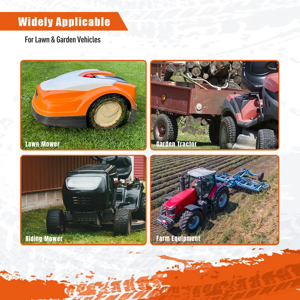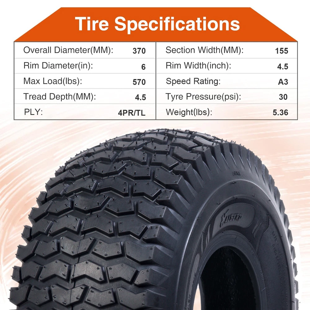 Lawn Mower Tire 15x6.00-6 15x6x6 Garden Tractor Turf Tire Heavy Duty Tubeless 15x6-6 Lawn Mower Tire Specification: TT/TL: TL Tire Aspect Ratio: 75% Ply Rating: 4PR Tire Overall Diameter:15'' Tire Section Width:6'' Rim Diameter: 6'' Rim Width: 4.5'' Tread Depth: 0.18'' Load-index: 61 Tyre Pressure(psi): 30 Speed Rating: A3 Load Capacity: 570lbs Weight: 5.3lbs Features: 15x6-6 Turf Tires – Ideal for Lawn & Garden Equipment Universal Fit Design The 15x6-6 tire is designed to fit most lawn mowers, small tractors, and garden equipment, offering a versatile replacement solution for various models. Durable Construction Made from high-quality rubber, this tire is built for exceptional wear resistance and puncture protection, ensuring long-lasting performance on various terrains. Turf-Friendly Tread Design The specially designed low-impact tread pattern minimizes damage to lawns while providing excellent traction and stability, ensuring efficient operation in grass maintenance tasks. Easy Installation Standard 6-inch rim diameter ensures quick and hassle-free installation. No specialized tools are required, making it convenient for DIY users. Multi-Purpose Application Perfect for a variety of applications, from residential gardening to professional lawn maintenance and agricultural equipment , this tire meets the needs of diverse working environments. Package Include: 1x Lawn Mower Tire 15x6-6 Tires only (rim/wheel not included) Payment Delivery details Terms of sales About us Contact us Payment 1.We accept various payment methods. Paypal、Debit card、Apple Pay、Google Pay ect. Delivery details 1. Order will be shipped within 1-2 business day after payment confirmed. 2. We will arrange shipment for you from US warehouse via UPS\Fedex. 3. Delivery time varies from 2 to 6 business days. 4. We will ship to your eBay address. Please check your address at checkout. We will not responsible for wrong or undeliverable addresses. Terms of sales Buyer Guarantee We assure you that we are a honest and super reliable seller on ebay, any problems can be solved in a satisfing way for you and any loss will not be brought to you as long as you will kindly contact us via ebay message or your private email. Please kindly contact us firstly if your purchasing is in trouble before leaving any bad feedback including neutral and negative feedback and leaving 3 stars or less stars to me on 4 criteria. Return Policy Please return the item within 30 days after receiving if you are not happy with your purchasing.All returns are expected to be in original conditions, please email us first for return address and instructions. About us 1. We are specialized dealer of ATV UTV SXS Premium Tires for more than 30 years. 2. We have office and warehouse in US to ensure fast shipment and after-sale service. Contact us 1. Our customer-oriented service strives for positive feedbacks with all 5 star selling ratings. 2. Please feel free to contact us via eBay message once you have any question before you giving us negative feedback or open case. 3.We will reply in 24 business hours. 4. Business time: GMT8 (9:00-18:00) from Monday to Friday.