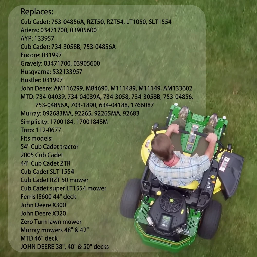 Tread: Smooth Product Description: — Precision Built For Long-Lasting Performance — 100% Brand New Items, Never Used Or Installed with: Cub Cadet: 753-04856A, RZT50, RZT54, LT1050, SLT1554 Ariens: 03471700, 03905600 AYP: 133957 Cub Cadet: 734-3058B, 753-04856A : 031997 Gravely: 03471700, 03905600 Husqvarna: 532133957 Hustler: 031997 John Deere: AM116299, M84690, M111489, M11149, AM133602 MTD: 734-04039, 734-04039A, 734-3058, 734-3058B, 753-04856, 753-04856A, 703-1890, 634-04188, 1766087 Murray: 092683MA, 92265, 92265MA, 92683 Simplicity: 1700184, 1700184SM Toro: 112-0677 Fits models: 54" Cub Cadet tractor 2005 Cub Cadet 44" Cub Cadet ZTR Cub Cadet SLT 1554 Cub Cadet RZT 50 mower Cub Cadet super LT1554 mower Ferris IS600 44" deck John Deere X300 John Deere X320 Zero Turn lawn mower Murray mowers 48" & 42" MTD 46" deck JOHN DEERE 38", 40" & 50" decks 【PREMIUM QUALITY】Long life-span matters, that is why our scalp deck wheel kit are made of a strong, tough main material that enhances the durability and reliability of the lawn mower to provides long service life 【FUNCTION】The scalp deck wheel kit has undergone a rigorous testing so that you will get a fairly reliable kit. Please do match the OEM Product Part number and the fitment 【REPLACES#】753-04856A, RZT50, RZT54, LT1050, SLT1554, 734-3058B, 753-04856A, 03471700, 03905600, 133957, 031997, 532133957, AM116299, M84690, M111489, M11149, AM133602, 734-04039, 734-04039A, 734-3058, 734-3058B, 753-04856,703-1890, 634-04188, 1766087, 092683MA, 92265, 92265MA, 92683, 1700184, 1700184SM, 112-0677 【FITMENT】with models: 54" Cub Cadet tractor| 2005 Cub Cadet| 44" Cub Cadet ZTR| Cub Cadet SLT 1554| Cub Cadet RZT 50 mower| Cub Cadet super LT1554 mower| Ferris IS600 44" deck| John Deere X300/ X320| Zero Turn lawn mower| Murray mowers 48" & 42"| MTD 46" deck| JOHN DEERE 38", 40" & 50" decks 【24-MONTH 】Exquisite craft, strict quality control and excellent after-sales service that is why our scalp deck wheel kit worth your purchase