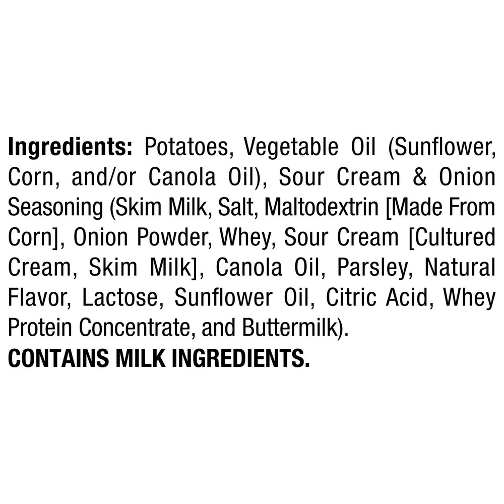 Lay's Sour Cream & Onion Flavored Potato Chips, Party Size, 12.5 oz BagPack of 2 Product details Tempt your taste buds with a flavorful sensation found in Lay's Sour Cream & Onion flavored potato chips. These chips offer smooth flavor that will delight your taste buds, making them perfect for sharing. The aromatic onion flavor contrasts with the creaminess of the sour cream and gives you a delicious flavor combination in your mouth. Loved for years, it's the creamy and tangy chip flavor that never goes out of style. Great sour cream and onion flavor for the LAY'S chips you love Delicious snack for the whole family Delicious LAY'S crunchy snack Party Size Creamy, Savory, Crispy, Delicious No Artificial Flavors Kosher - Dairy