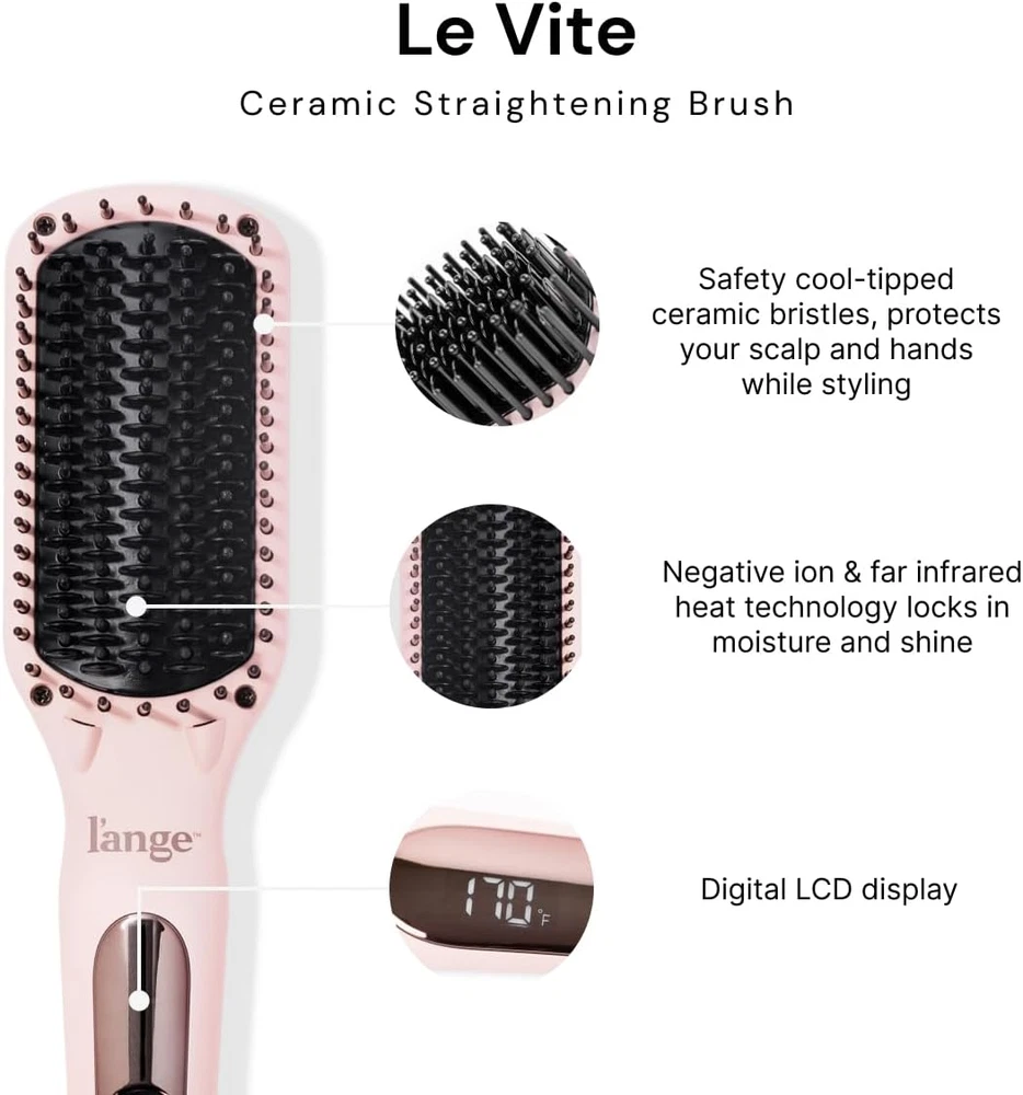 Le Vite Straightening Brush | Heated Straightener Flat Iron for Smooth Product Details DESIGNED TO CREATE SMOOTH, SLEEK HAIR – Enjoy hair that’s lustrous and smooth with Le Vite hair straightening brush. No matter what type of hair you have – straight, curly, wavy, or tightly coiled – this hot brush is the perfect way to achieve the straight, frizz-free locks you’ve been looking for. POWERFUL YET EASY TO USE – Combine the power of a hair straightener with the simplicity of a hairbrush in one game-changing tool. On dry hair, all it takes is a single pass from roots to tip at a slow to moderate pace to straighten and seal your strands for the sleek beautiful look you desire. THE LOOK YOU WANT IN MINUTES – Le Vite heats up quickly and evenly, and you can adjust the temperature to the setting you want. This helps cut your styling sesh in half while reducing the risk of damage from overheating. The result is a look that’s lustrous, sleek, and oh-so-ravishing! STATE-OF-THE-ART CONTROL – LCD digital interface of the Le Vite brush gives you the control to set the precise temperature you want up to 450°F. Cutting-edge double negative ion technology helps keep hair smooth and hydrated because it traps moisture and seals the cuticle to help hair stay balanced and look healthy. RISK-FREE MONEY-BACK GUARANTEE – Your satisfaction and positive experience is our #1 priority. Contact us for a hassle-free return if you’re not happy with your purchase. Product Description More Game Changing Styling Tools from L'ange Hair Add to Cart Add to Cart Add to Cart Add to Cart Add to Cart Customer Reviews 4.2 out of 5 stars 7,687 4.2 out of 5 stars 7,687 4.4 out of 5 stars 12,113 4.4 out of 5 stars 12,113 4.1 out of 5 stars 717 4.5 out of 5 stars 881 4.3 out of 5 stars 595 Price $39.49 $ 39 . 49 $39.49 $ 39 . 49 — $69.00 $ 69 . 00 $49.00 $ 49 . 00 — $191.99 $ 191 . 99 Multi-Setting ✔ ✔ ✔ ✔ ✔ ✔ ✔ 360 Degree Swivel Cord ✔ ✔ ✔ ✔ ✔ ✔ ✔ Professional Quality ✔ ✔ ✔ ✔ ✔ ✔ ✔ Adjustable Temperature ✔ ✔ ✔ ✔ ✔ ✔ ✔ Ergonomic construction ✔ ✔ ✔ ✔ ✔ ✔ ✔ Item model number 2328 Product Dimensions 13.74 x 2.24 x 4.41 inches; 1.57 Pounds Color Blush Material Ceramic Product Benefits function(f) {var _np=(window.P._namespace("DetailPageProductOverviewTemplatesJava"));if(_np.guardFatal){_np.guardFatal(f)(_np);}else{f(_np);}}(function(P) { P.when('A').execute(function(A){ A.on('a:truncate:po-attribute-truncate-0:updated', function(data) { var isTruncated = !data.truncateInstance.getIfTextFits(); var seeMoreElement = document.getElementById('po-attribute-see-more-id-0'); if(seeMoreElement) { seeMoreElement.style.display = isTruncated ? '' : 'none'; } }) }); })); Adjustable temperature range: 180°F – 450°F | 30 Minute Auto Shut-Off | Heat-proof cord up to 450°F (232°C) | LCD digital interface | Double Negative Ion Technology See more Shape Flat Hair Type All 2.24 inches x 13.74 inches x 4.41 inches. Weight: 1.57 lb Payment Details We accept all payments via Ebay using Credit Cards , PAYPAL , Apple Pay and many others Shipping Details We are always working hard to ensure your package arrives as soon as possible. Please understand that some factors like weather, high postal traffic, and the performance of shipping companies are outside of our control. Delivery & Return Policy Details We offer a 30-Day Return Policy on items in which you are not completely satisfied with. You have the option of a full-refund or an exchange of the item. No returns are available on items shipped outside of the USA.