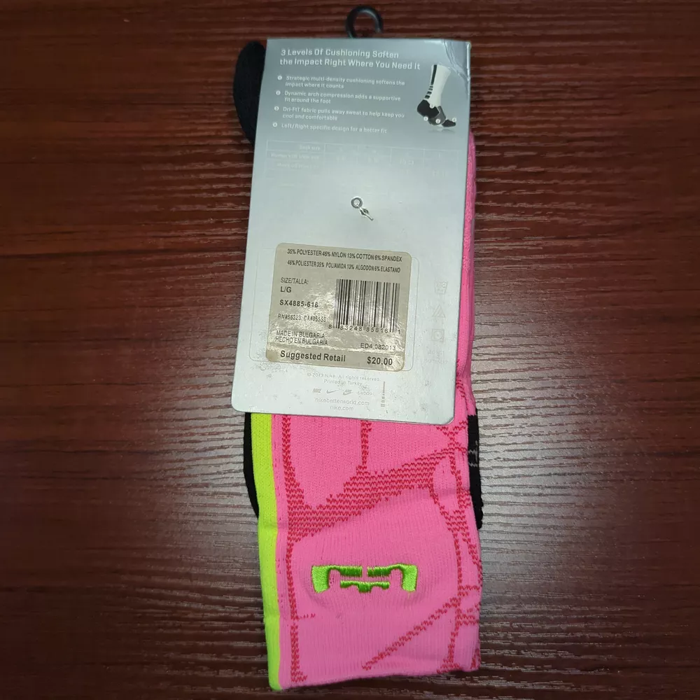 LeBron Nike Hyper Elite Socks Pink/Yellow Size Large Brand new with tags 100% Authentic Fast Shipping: Ships in 1-2 business days from Illinois Many colors available, check out my page to see them all Message me with any questions The Nike Elite Basketball Crew Socks feature Dri-Fit fabric that keeps your feet cool and comfortable. It’s made for durability and offers a supportive and snug fit. The Nike Elite Basketball Crew Sock is a must own for any basketball player. Perfect for basketball, volleyball, and other sports Pair different colorways with your Kobe's, Lebron's, KD's and more. Performance basketball crew socks deliver superior fit and comfort. Strategically placed cushioning absorbs impact Dri-Fit technology helps keep feet feeling dry and comfortable. Left/right anatomical design for targeted comfort. Ventilation zones promote breath-ability to keep you cool 63% polyester, 18% nylon, 16% cotton, 3% spandex Size Guide Small: Youth 4-6 Medium: Men's 6-8 Large: Men's 8-12 Extra Large: Men's 12-15