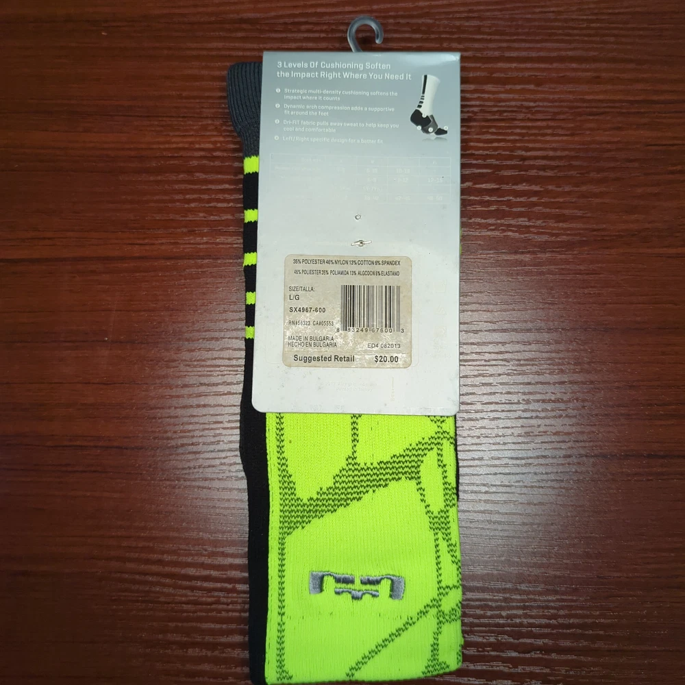 LeBron Nike Hyper Elite Socks Volt Yellow/Black Size Large Brand new with tags 100% Authentic Fast Shipping: Ships in 1-2 business days from Illinois Many colors available, check out my page to see them all Message me with any questions The Nike Elite Basketball Crew Socks feature Dri-Fit fabric that keeps your feet cool and comfortable. It’s made for durability and offers a supportive and snug fit. The Nike Elite Basketball Crew Sock is a must own for any basketball player. Perfect for basketball, volleyball, and other sports Pair different colorways with your Kobe's, Lebron's, KD's and more. Performance basketball crew socks deliver superior fit and comfort. Strategically placed cushioning absorbs impact Dri-Fit technology helps keep feet feeling dry and comfortable. Left/right anatomical design for targeted comfort. Ventilation zones promote breath-ability to keep you cool 63% polyester, 18% nylon, 16% cotton, 3% spandex Size Guide Small: Youth 4-6 Medium: Men's 6-8 Large: Men's 8-12 Extra Large: Men's 12-15