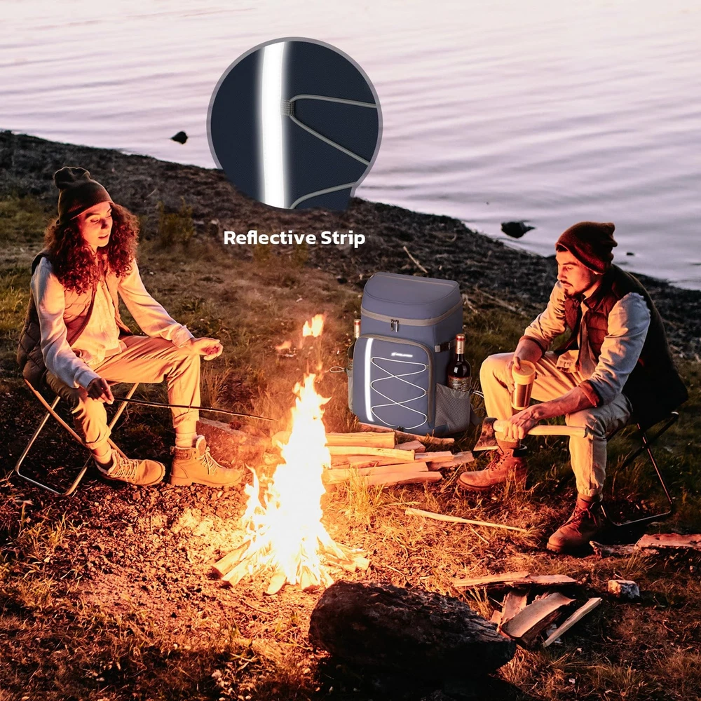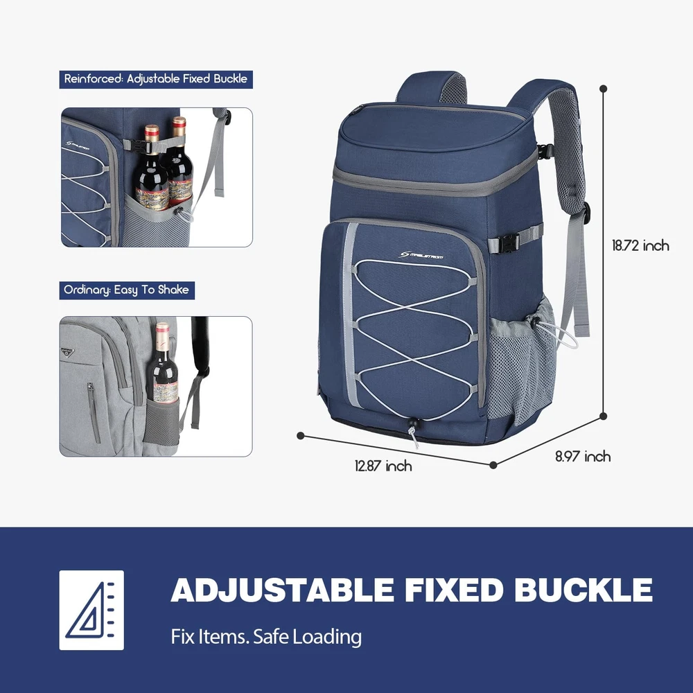 Leak-proof & Insulated:High-density insulation material and leak-proof liner inside of the insulated cooler backpack work together to make sure anti-leaking and keep food hot / cold for 16 hours. The interior lining is made of high quality material and easy to clean. You can drink cold beer,eat fresh snacks or fruit with friends or family anytime. Spacious and Organized: The insulated backpack features a large capacity and multiple compartments, measuring 12.87”x 8.97”x 18.72”(LxWxH). This Leak-proof backpack cooler can hold up to 35 cans (32L).With a roomy zipper main compartment, top zipper pocket, front zipper pocket, front elastic rope net, front cutlery storage bag, 2 mesh side pockets, hidden back zipper pocket, and a shoulder strap card pocket, it provides convenient storage for all your needs. Ergonomic & Comfortable Design: Thicker padded back with ergonomic breathable design paired with adjustable,breathable and padded S shoulder straps help to reduce fatigue during a long day of trip. The backpack ice chest comes with a handle,which is labor-saving and durable. The adjustable chest buckle works perfectly to distribute the pack’s weight and keep it steady and centered. And chest buckle designed as a survival whistle for quick and easy use in case of emergency. Unique Function Design: Two condiment bottles can be placed on the top of the tableware storage bag for easy access. The shoulder strap has a stainless steel bottle opener for easy opening of beer and drinks. On the left side of the backpack,there are five webbing holes above the net bag,which can hang keys,water bottles and other tools. There is an adjustable buckle above the right mesh bag to hold the wine bottle perfectly. The shoulder strap has a stretch cord to hang the sunglasses. Versatile: Besides used as excellent soft cooler insulated leakproof bag,it is also a perfect lightweight gear for lunch backpack,hiking backpack,camping backpack,fishing backpack,travel backpack,hunting,trail,cycling and other outdoor activities. It is Suitable for both men and women.