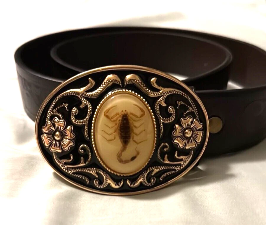 A Western-style unisex leather belt in brown, size 34, featuring a scorpion buckle with horse stamped embellishments and a flower themed buckle design, featuring a real scorpion encased in resin. This belt is perfect for those interested in a cowboy or western-inspired look.