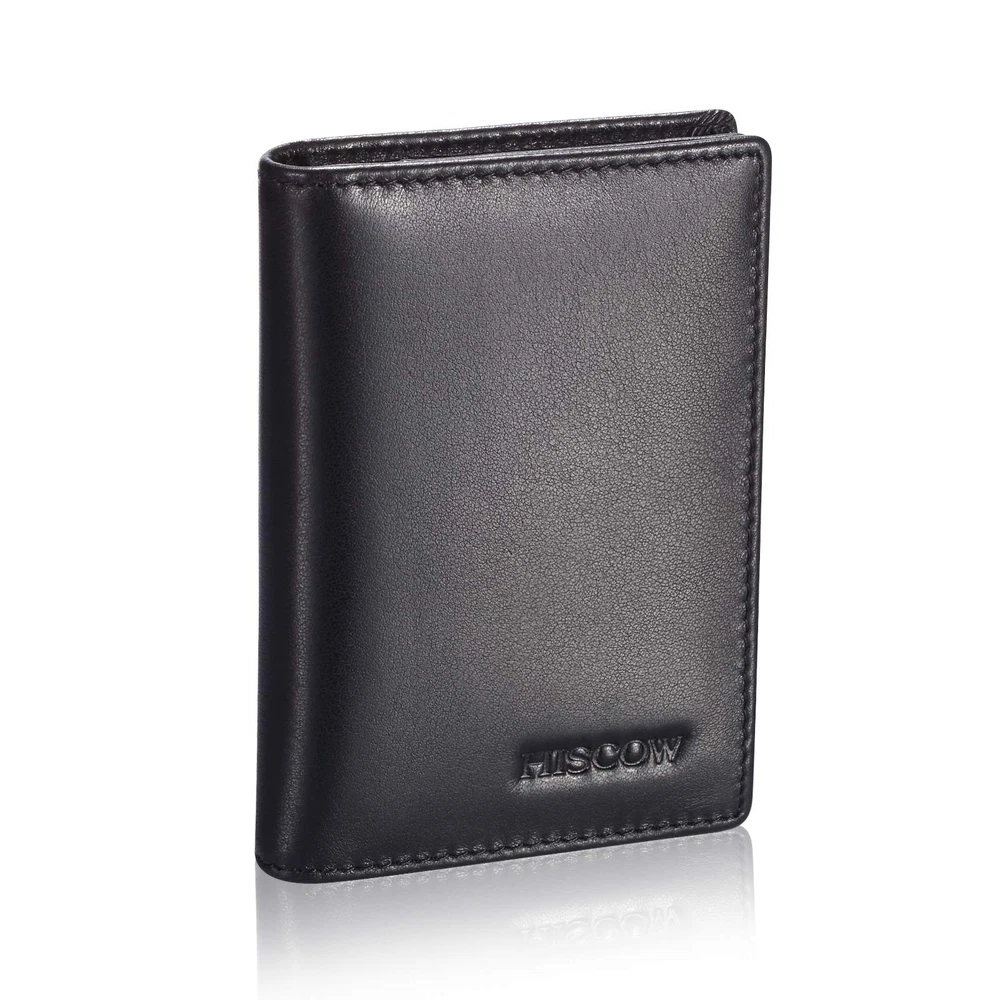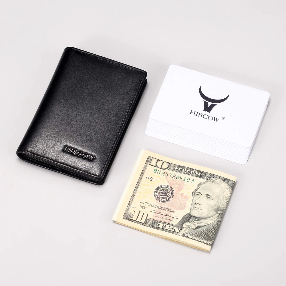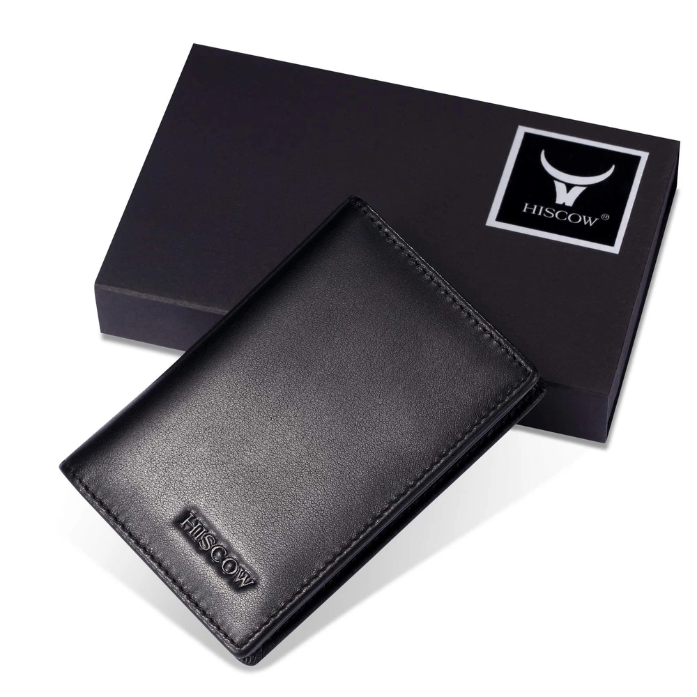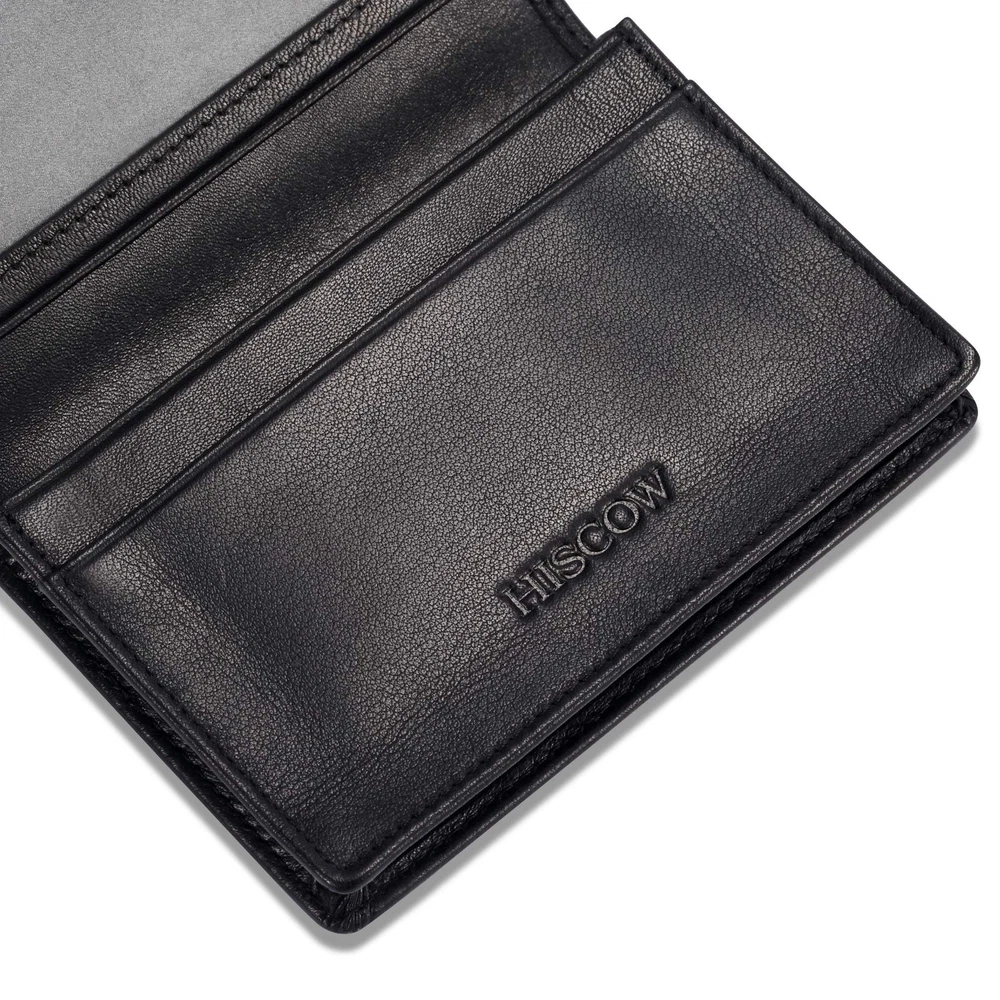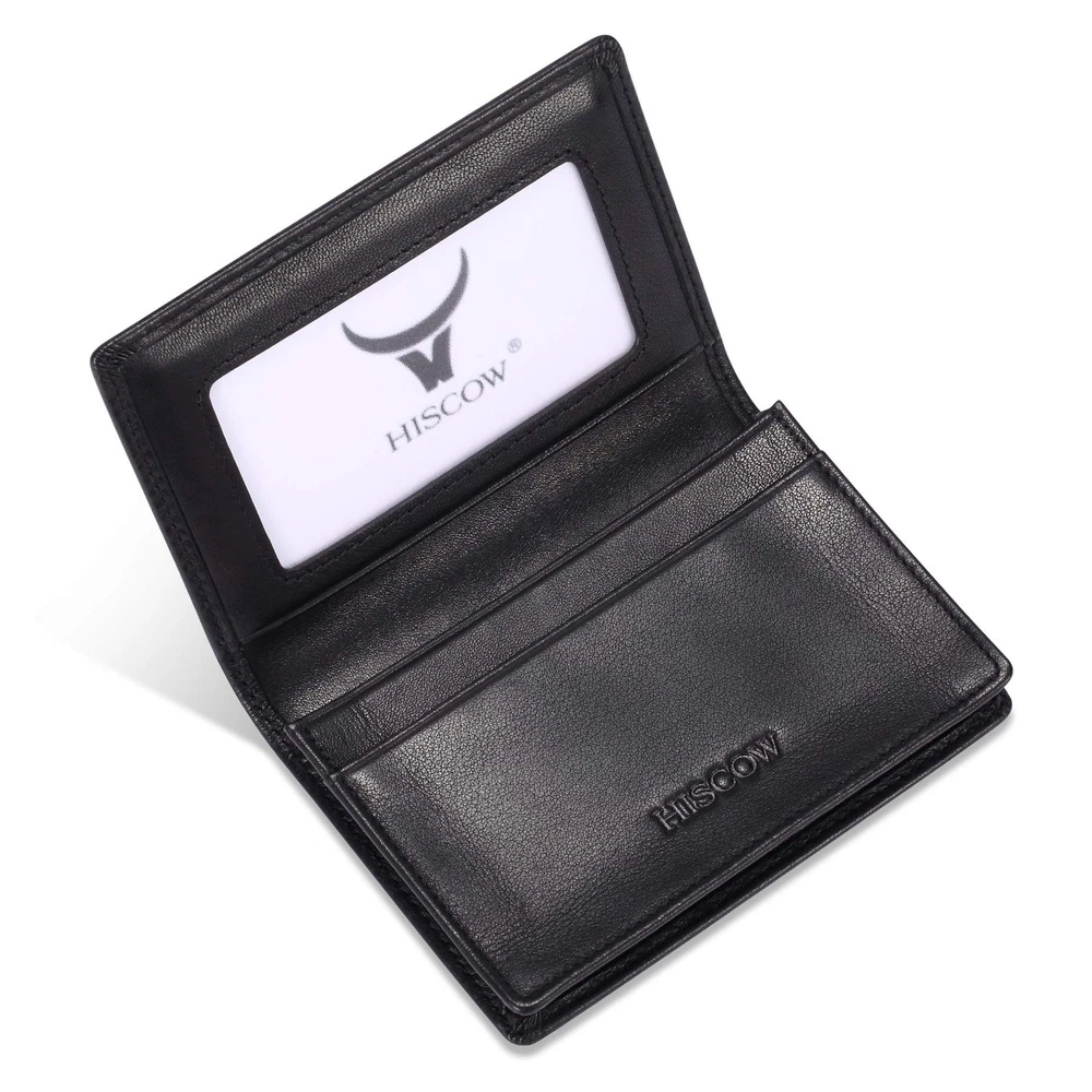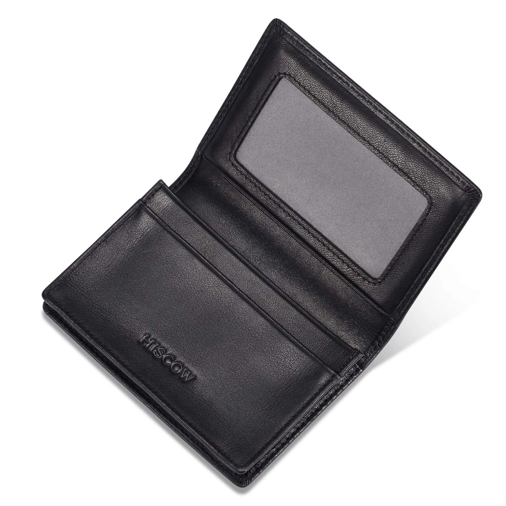 The Advantage: Supple full grain nappa leather, handmade in Italy by senior craftsmen with authentic quality. Our genuine leather is rich looking, smells wonderful and smooth texture Light and Compact: 4.06"H x 2.8"W x 0.55"D. Small size is perfect to fit in your front shirt pocket or handbag High Capacity: holds up to 25 business cards or 15 credit cards depending on thickness Well Built: 1 Large compartment for business cards or money, 1 interior slot for credit card, 1 clear plastic ID window What You Get: Leather Business Card Holder, in an exact-fitting and classy matte-black box