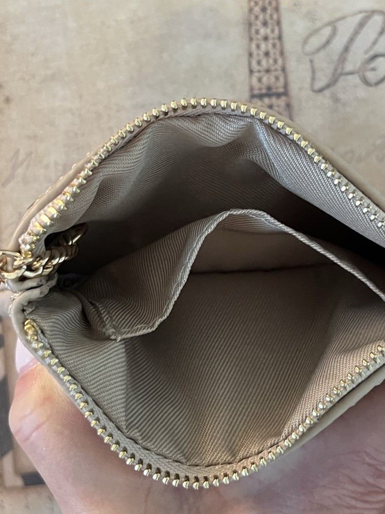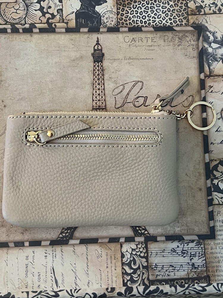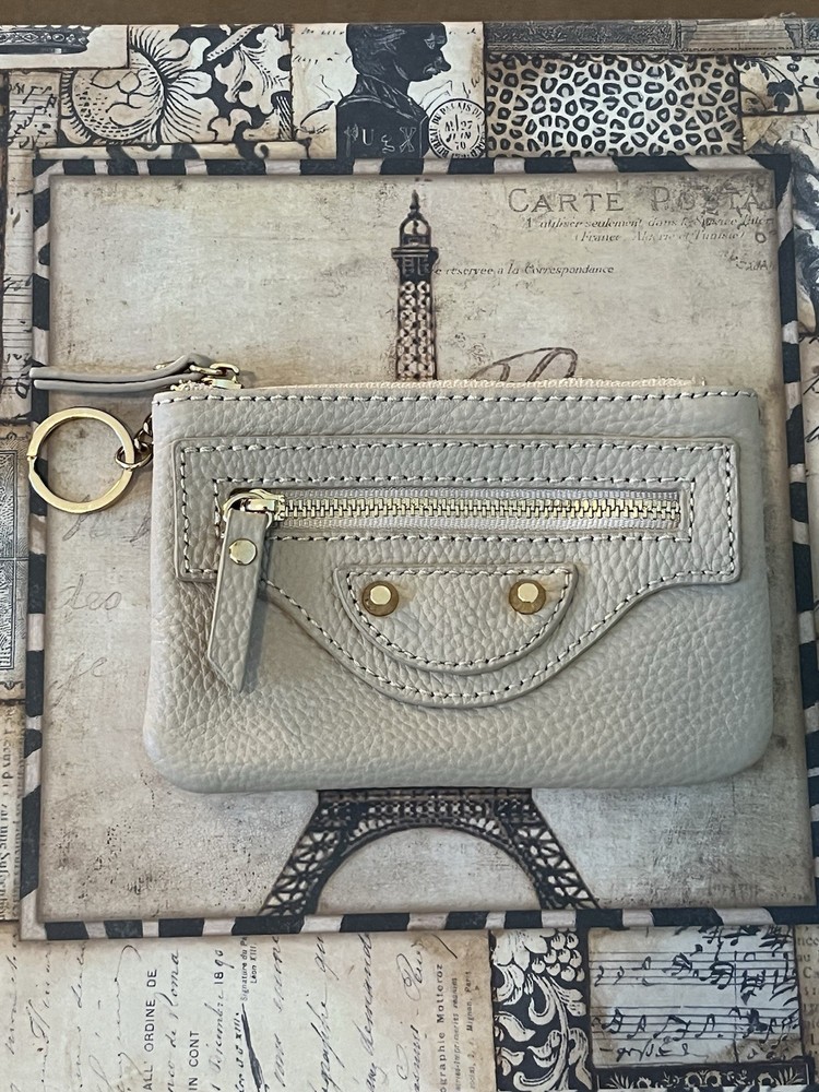 This Leather Credit Card Key Case is a stylish and practical accessory for women. Made of high-quality leather in a solid tan color, this pouch wallet features a zip closure and multiple compartments for cards and keys. The designer theme with stud detail adds a touch of sophistication, while the convenient exterior zip pocket and inside slit pockets keep your essentials organized. The compact size of 5 1/2" x 3 1/2" makes it easy to carry in your purse or on your keychain, making it a versatile and chic addition to any outfit. New with tags