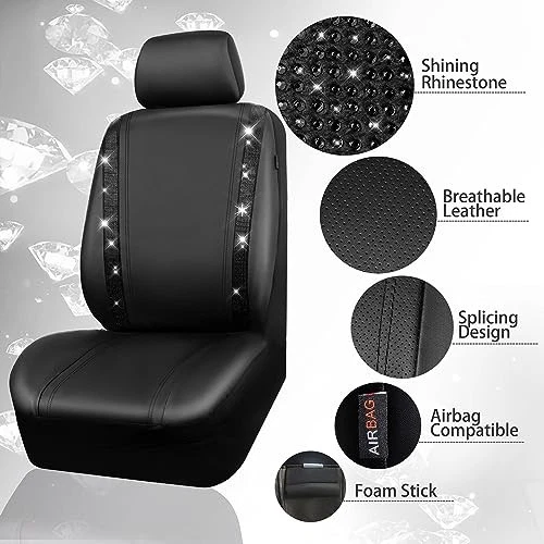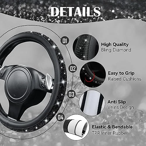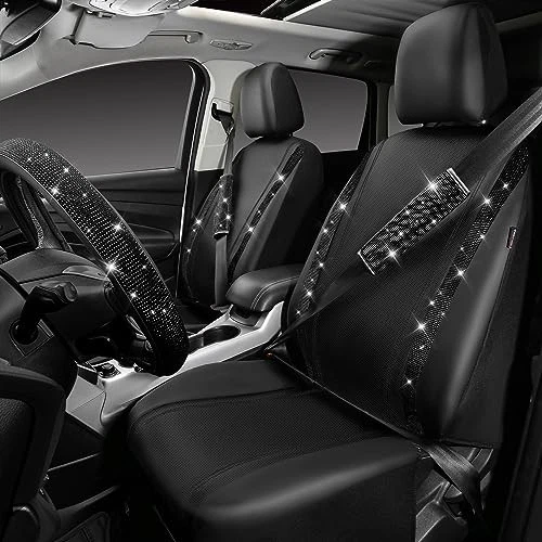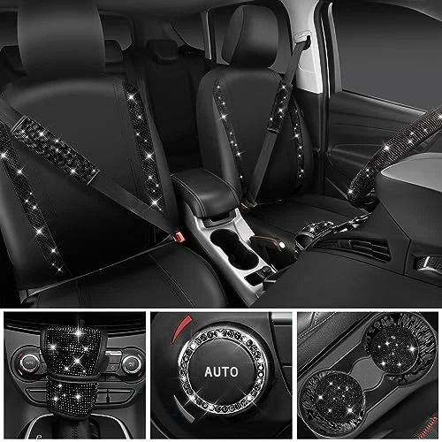 Return Policy Fast Delivery Trusted seller Leather Diamond Bling Seat Covers Sets 11 pcs, Bling Car Accessories Set for Women, Sparkly Rhinestone Steering Wheel Cover Sets, Glitter Cute Car Interior Sets for Women Girl, Black Diamond Product Description BLING DIAMOND DESIGN: The bling auto accessories set is designed by real cars and models, and the Bling diamond car kit can perfectly fit 95% of the models on the market. It's the perfect car decoration, perfect for Valentine's Day, birthdays, or a surprise gift for family, friends and colleagues. HIGH-QUALITY MATERIAL: Gorgeous steering wheel flash cover to improve the appearance of steering wheel and interior, diamond seat belt cover to protect your driving safety, two diamond silicone coasters can make the cup holder no longer dirty, diamond Seat Belt Cushion give you a different feel, the full interior will be sparkling and eye-catching in the car. EASY TO INSTALL: Universal sizes Fits most cars. 9 trims fit most full-size trucks and SUVs, buckets or oversized cars. The Leather diamond front seat cover made of premium Leather with pretty white rhinestones made. The steering wheel cover can be straightened about 14-15.5 inch in diameter, the coaster diameter is about 2.7 inches, the shoulder straps are about 9.2 x 2.3 inches, the ring is about 1.6 inches, the gear cover is about 5 x 3 inches. SUPER VALUE PACKAGE: Pack includes 11 Pcs: Two front seat covers, Two seat hats, 1 Diamond Steering Wheel Cover, 1 Diamond Gear Cover, 2 Diamond Seat Belt Covers, 1 Bling One Button Start Rings, 2 Diamond Cup Holder Coasters. Simple and fashionable design, diamond decoration. Flashing under the light and through the windshield makes your car unique and charming. EXCELLENT SERVICE: Our Brand is and we offer high quality CAR STEERING WHEEL COVER, Car Floor Mats, Car seat covers, and other car accessories set. We put product quality and your trust first. We do our best to provide you with quality service. Shipping Returns Payment Shipping Shipping is FREE to all addresses other than APO/PO boxes in the lower 48 states. All our stock ships from US-based warehouses. Shipped via USPS or UPS (depending on location and package weight) Unless stated otherwise, all orders will ship within 24-72 hours of your payment being processed. Check our feedback to see the great reviews of FAST shipping we offer. Returns Seller does not accept returns Payment We currently accept payment via eBay managed payments only. Once payment is cleared, we will dispatch your shipment within 1-3 business days. Please refer to the "Shipping" tab for more information regarding shipping speed to your destination.
