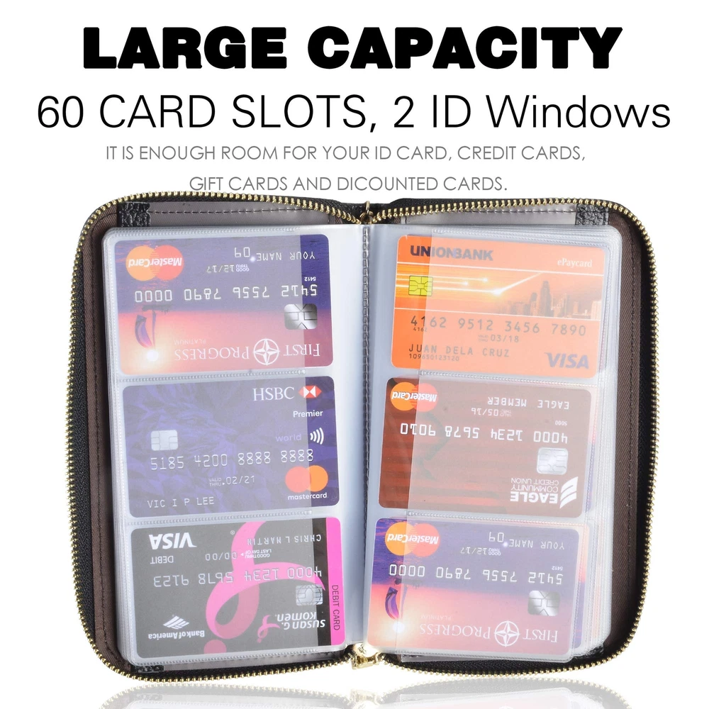 Leather Credit Card Holder Wallet RFID Blocking Zippered Purse with 60 Slots Features: Material: Genuine Cowhide Leather and PVC card slots. Size: 7.48"*3.54"*0.98" (19*9*2.5 CM) Large Capacity: The card holder has 60 cards slots and 2 ID Windows. It is enough room for your ID card, credit cards, gift cards and dicounted cards. Small size is perfect to fit in your pockets or handbags. RFID Blocking Design: RFID Blocking designed lining keeps your vital information Secure. Be safe and protected from Electronic Pick pocketing. Great Gift: Great gift for mother, daughter, grandmother and so on. Description: Please pay attention to this: Today, we received many intended and malicious bad reviews, please don't worry, our quality is very good, please read Verified Purchase reviews, all are good! Thanks If you need more quantity than shown available - just send me a message and I'll increase the purchased limit for you 🌺 SHIPPING We are always working hard to ensure your package arrives as soon as possible. Please understand that some factors like weather, high postal traffic, and the performance of shipping companies are outside of our control. We offer free shipping to the lower 48 states. We do not accept P.O. Boxes. Please provide a physical address. Best wishes ☀️ TRANSLATE with x English Arabic Hebrew Polish Bulgarian Hindi Portuguese Catalan Hmong Daw Romanian Chinese Simplified Hungarian Russian Chinese Traditional Indonesian Slovak Czech Italian Slovenian Danish Japanese Spanish Dutch Klingon Swedish English Korean Thai Estonian Latvian Turkish Finnish Lithuanian Ukrainian French Malay Urdu German Maltese Vietnamese Greek Norwegian Welsh Haitian Creole Persian TRANSLATE with COPY THE URL BELOW Back EMBED THE SNIPPET BELOW IN YOUR SITE Enable collaborative features and customize widget: Bing Webmaster Portal Back
