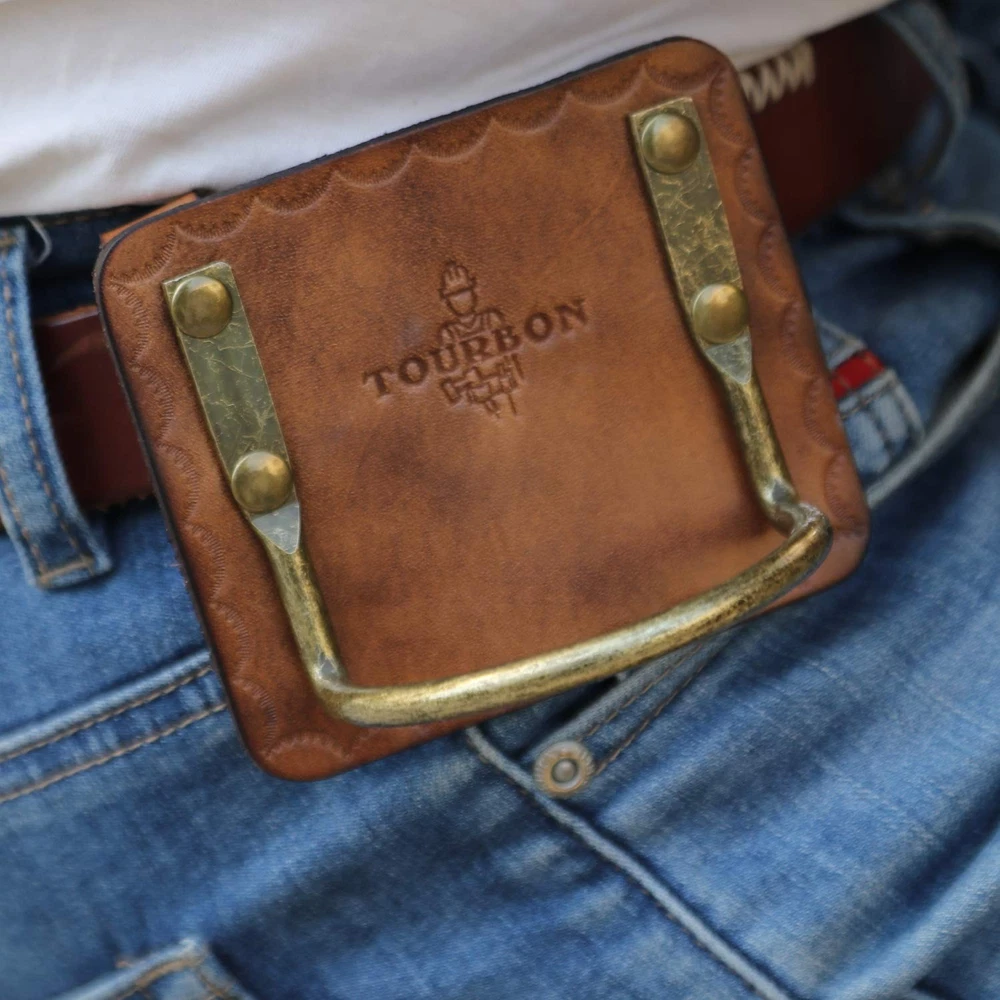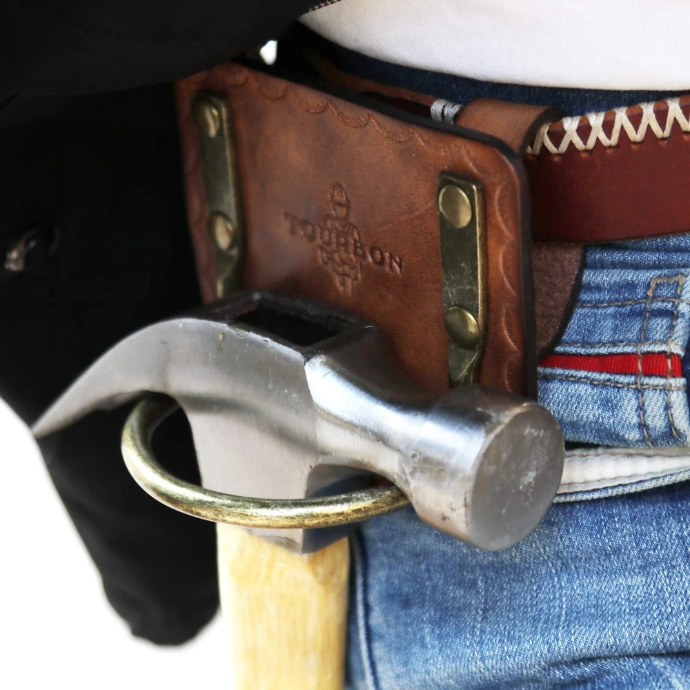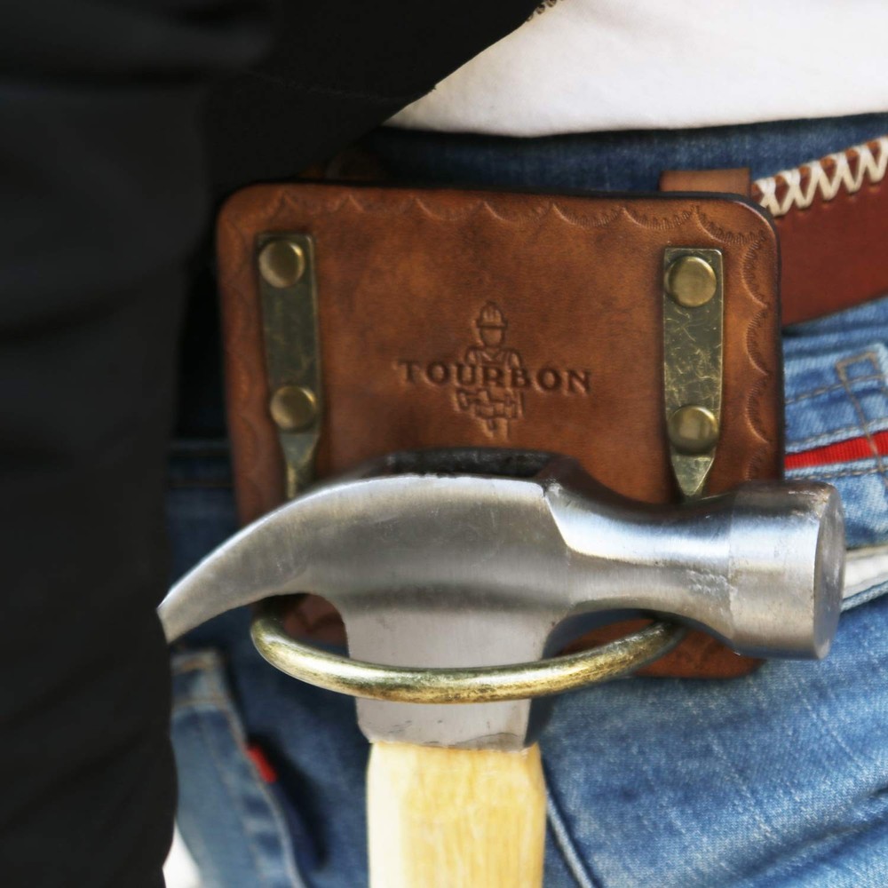 Leather Hammer Holder With Steel Loop 1.Designed with a wide steel loop for easy quick accessibility. 2.Keep your axe nearby with this tool holder pouch. 3. Rivets with caps for safety 4.Package: 1 pieces Hammer Holder 5. Fits Most models of hammers Leather Hammer Holster: tool holder made from leather and riveted cradle-style steel loop Steel Hammer Loop: Hammer hanger with cradle loop design to keep the hammer from moving, the inside dimensions of the hammer hook are 2.55" W from left to right and 1.85" D from front to back Enhanced Design: The tool holster has 4 rivets for reinforcement, to strengthen the fixed parts Fits 1.5" Width Belts: Approx. 1.96" belt loop that fits for a 1.5" belt, the holster can be positioned on a belt ready to receive a hammer or hatchet so your hands can be free to work Keep Tools at the Ready: This hammer hook keeps the axe safe and secure while allowing easy access, good for carpenters, electricians, framers, construction workers, and more