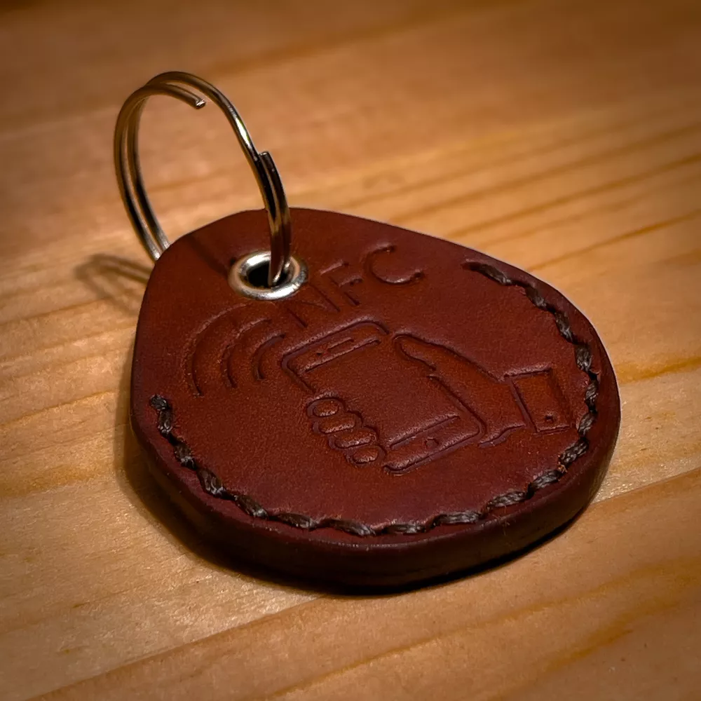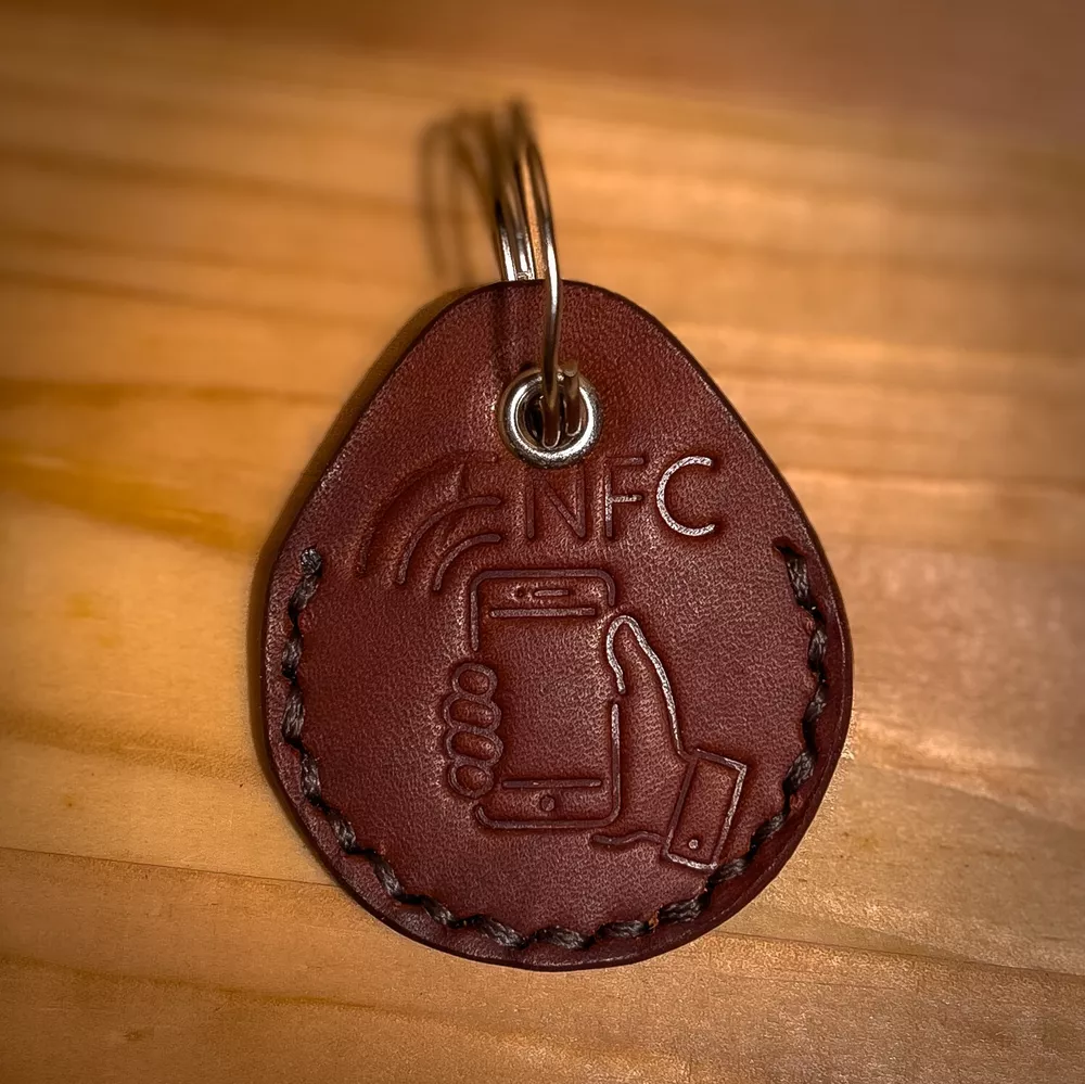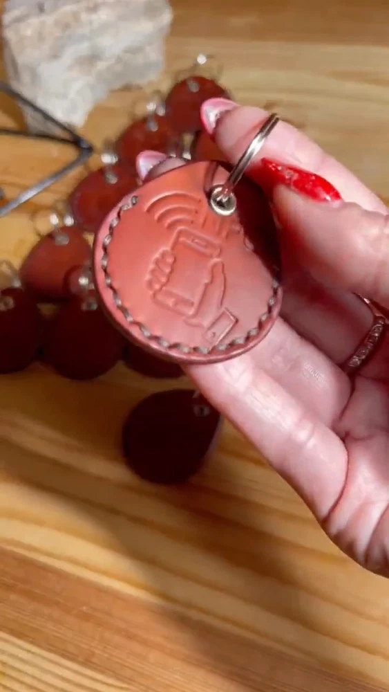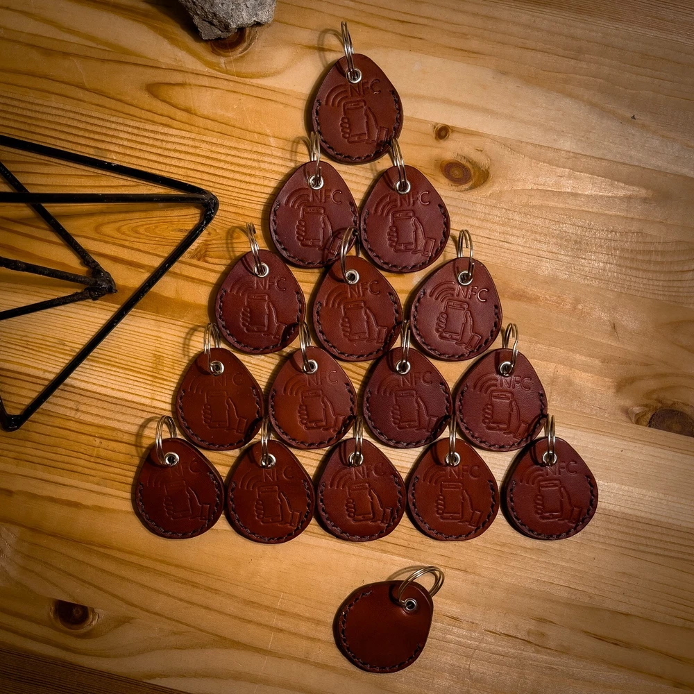 Natural leather, veg tanned,thick and strong skin (5 oz or 2mm thickness), keyring with NFC tag only included. Handmade. Shipping from Ukraine. You can write your telephone number, or GEO location, or BTC wallet number, Wi-Fi password, or social media link, or website. Just hold your phone above keyring, and it will be automaticly scanned.