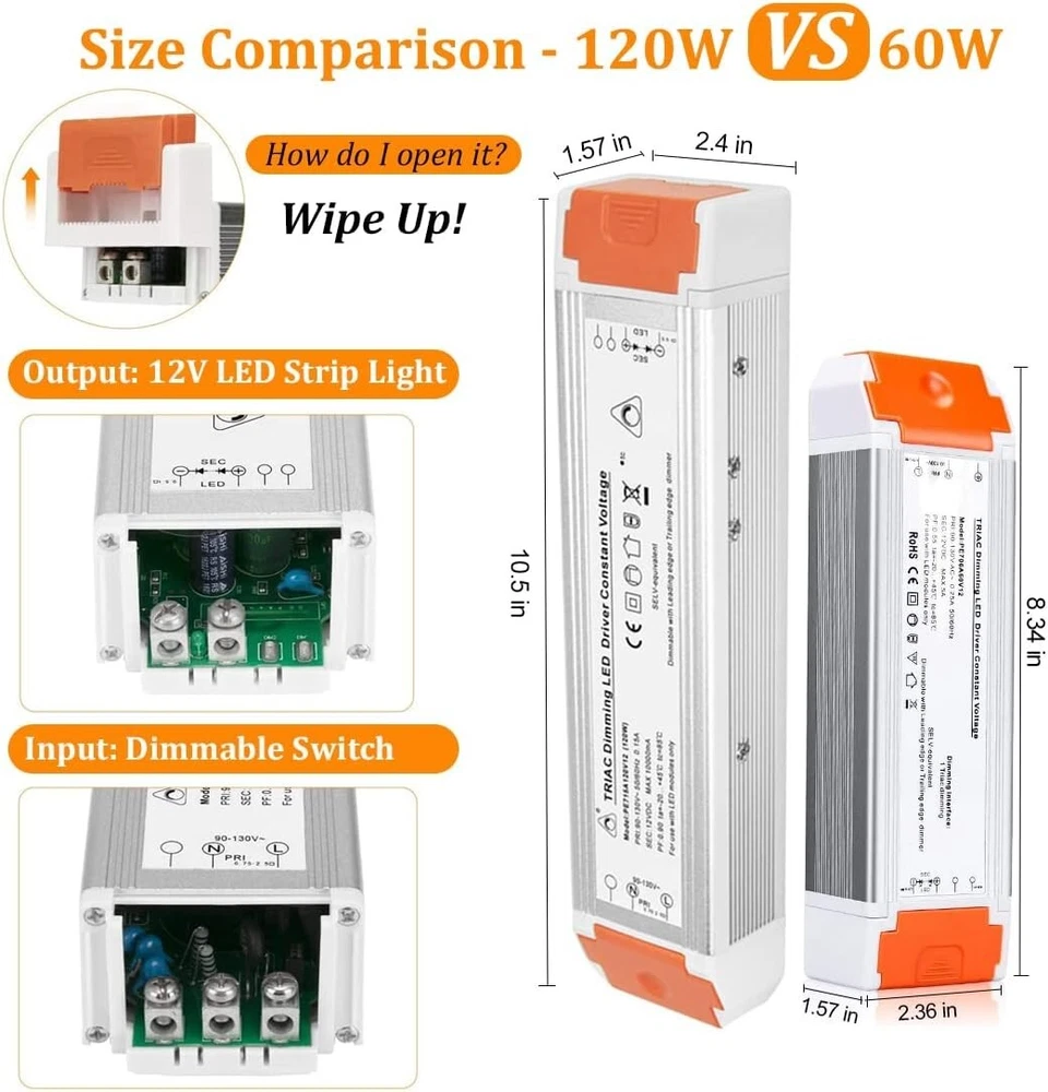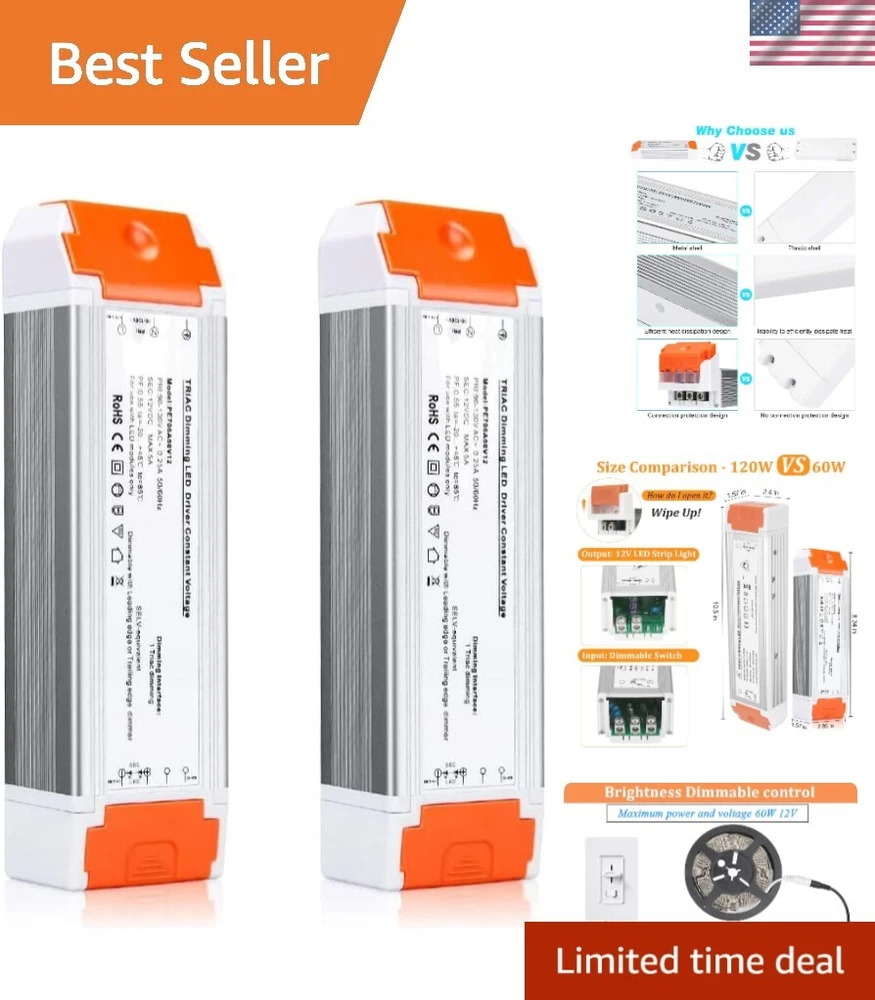 Led Driver 12v DC 60w 2 Pack Quiet Operation Universal Regulated dimmable Power Supply Input/Output Isolation Protection led Transformer dimmable for led Light 2 Pack Super Compatible - Dimmable LED driver is compatible with almost all AC control systems constant voltage led products. The 12v dimmable led driver is the best choice for landscape lighting and home lighting. Strong Stability - Dimmable LED driver flexible start, MCU control dimming process is better with no AC flicker high efficiency and stable performance. Input and output yellow isolation waterproof and dustproof protectio. Protection - Short-Circuit / Over Current / Over Voltage(OVP)/Under Voltage (Blackout Protection) and Auto-recovery Mode. Requirements for Use - The maximum power voltage is 60W 12V to ensure that the led power supply continues to work normally. The dimmable function requires both a dimmer switch and a dimmable LED light to be connected to dimmable power supply is compatible with Lutron, Leviton and other dimmer switches on the market. 5 s satisfaction and Maintained - Easily troubleshoot and replace at any time. If you have any questions about purchasing or installing, please let us know through the order or store page.