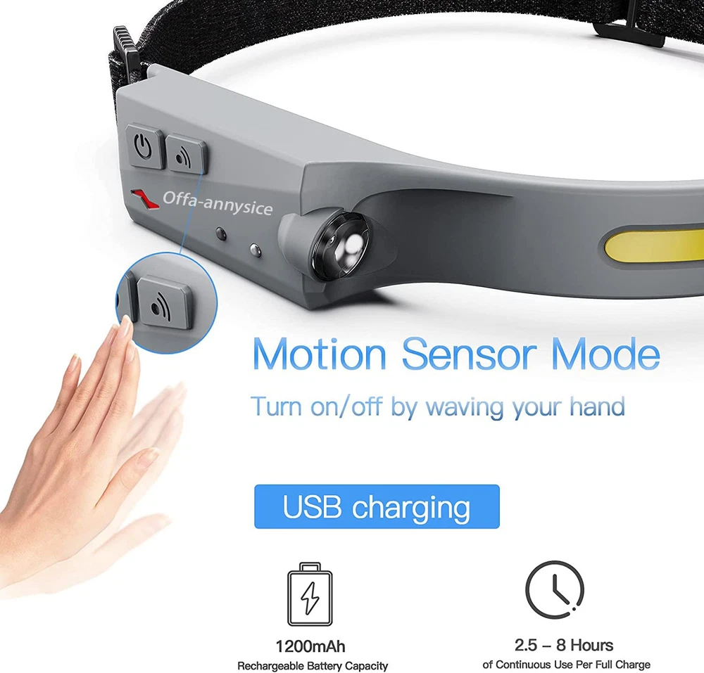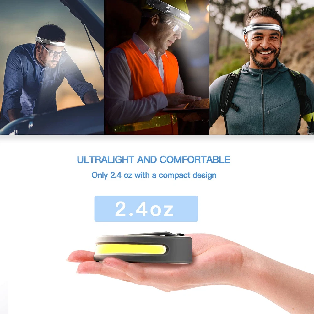 230° Wide Beam & 350 Lumens: Different from the traditional headlamp, our camping headlamps have a 230° lighting range that can reach a distance of 100 square meters around you. With 350 Lumens output that can be clearly seen even from 150ft away, enough to deal with all the darkness. Wave Induction & 5 Lighting Modes: With the side wave induction sensor, you can easily turn on/off the headlamp. and press the power switch to cycle through 5 lighting modes. Rechargeable Headlamp & Long Lasting: Built-in 1200mAh high-capacity battery that can be charged by USB cable(included) up to 8 hours of continuous use. Charging time: within 2.5h fully charged. Lightweight & IPX4 Waterproof: Only 2.4 ounces, the ultralight design will make you forget you're wearing it. Professional IPX4 level waterproof function, no need to worry about rains or snow. Perfect for camping, hiking, cycling, fishing, or car repairing.