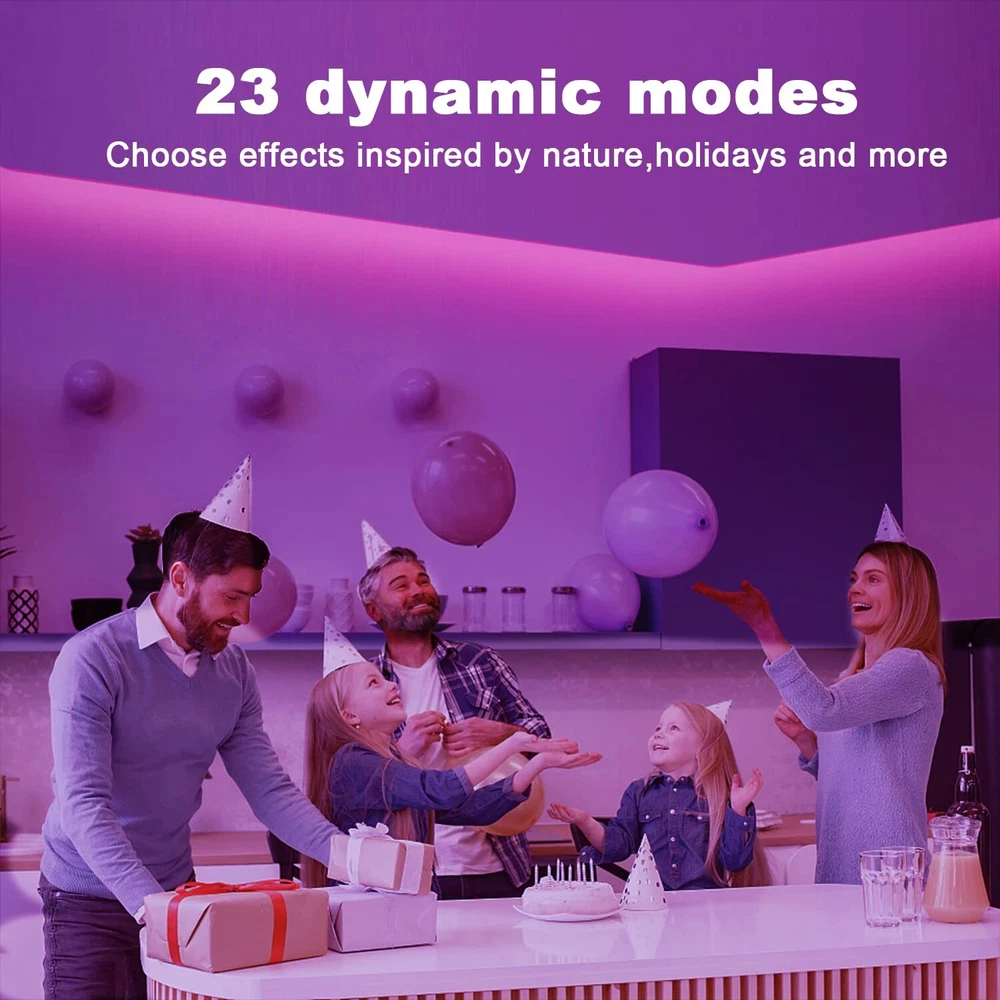 Packing List: 2*100feet led lights 1*instruction manual 1*remote controller 1*adapter [Smart APP and IR Remote Contorl]: Download the app with a stable bluetooth connection,control your LED lights with 16 million colors to choose from; 23 dynamic modes to switch at any time (remote control with DIY mode) in different speeds [Improve Life Scenes]: The LED light bar with a sensitive microphone can easily convert different atmospheres in the same space to synchronize with your favorite music, change the lights with the music rhythm, easily create a party atmosphere, and add color to your holiday [Timing Setting]: Choose your favorite color and preset timer at will. The Led light bar will automatically turn on/off at the set time. Repeat this setting according to the date you set or adjust the brightness as needed [Easily Setup]: It is easy to install and cut, and can customize the length according to your specific design. Just be careful cut along the copper wire markings. Tear off the strong adhesive tape on the lamp belt, fix the strip lamp on a clean and dry surface, and finish it in a few minutes [Practical and flexible]: It is long enough to meet multiple scenario options. There are 200 feet (2 rolls of 100 feet), and the strips are trimmed to fit your space. It is enough to illuminate the bedroom, kitchen, living room and bar, and easily transform the different atmosphere of the same space