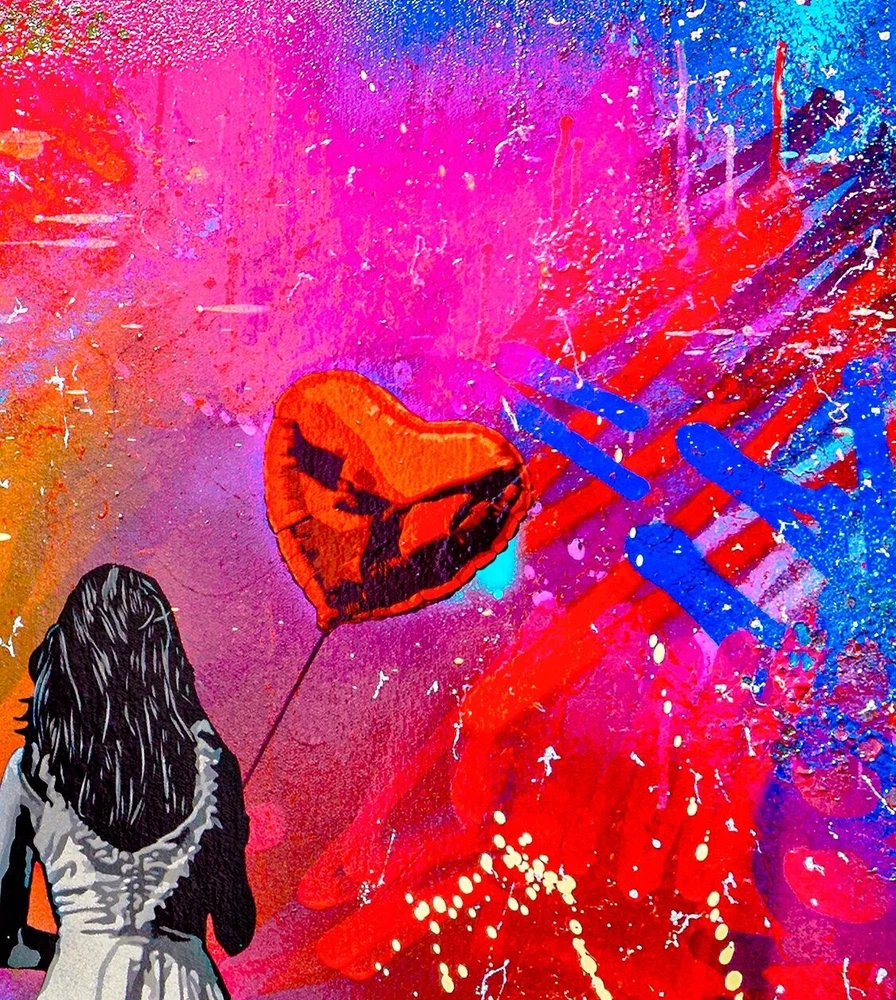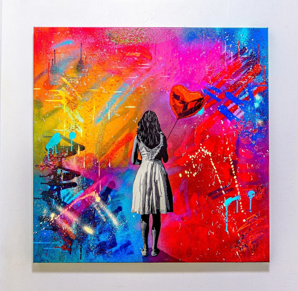 Lee Henderson - If I Gave You My Heart , Original Acrylic Painting A stunning original acrylic painting by Lee Henderson (1979) , titled “If I Gave You My Heart” . This artwork is a vibrant reinterpretation or response to Banksy’s iconic Girl with Balloon . With its bold, multicolored abstract background and emotional depth, Henderson captures themes of love, vulnerability, and hope in his distinctive contemporary style. • Object: Painting • Technique: Acrylic on canvas • Dimensions: 61 × 61 × 3 cm • Year of Production: 2023 • Signature: Hand-signed by the artist • Condition: New • Framing: Sold unframed Details: In this piece, Henderson reimagines the timeless motif of a girl holding a balloon, presenting a red heart-shaped balloon against a dynamic and colorful backdrop. The textured canvas and graffiti-inspired splashes of color bring an urban, raw energy to this painting, making it a standout piece for collectors of modern and street art. This original painting is a one-of-a-kind work, perfect for anyone looking to add a bold and emotional statement piece to their collection. It will be securely packaged to ensure safe transportation.