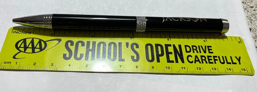 Leeds Ball Point Pen Glossy Black With Etched Chrome Trim JACKSON On Top Section of Pen. Twist to open and close. Very impressive looking! 5 5/8” Long x 3/8” Wide In Original Box