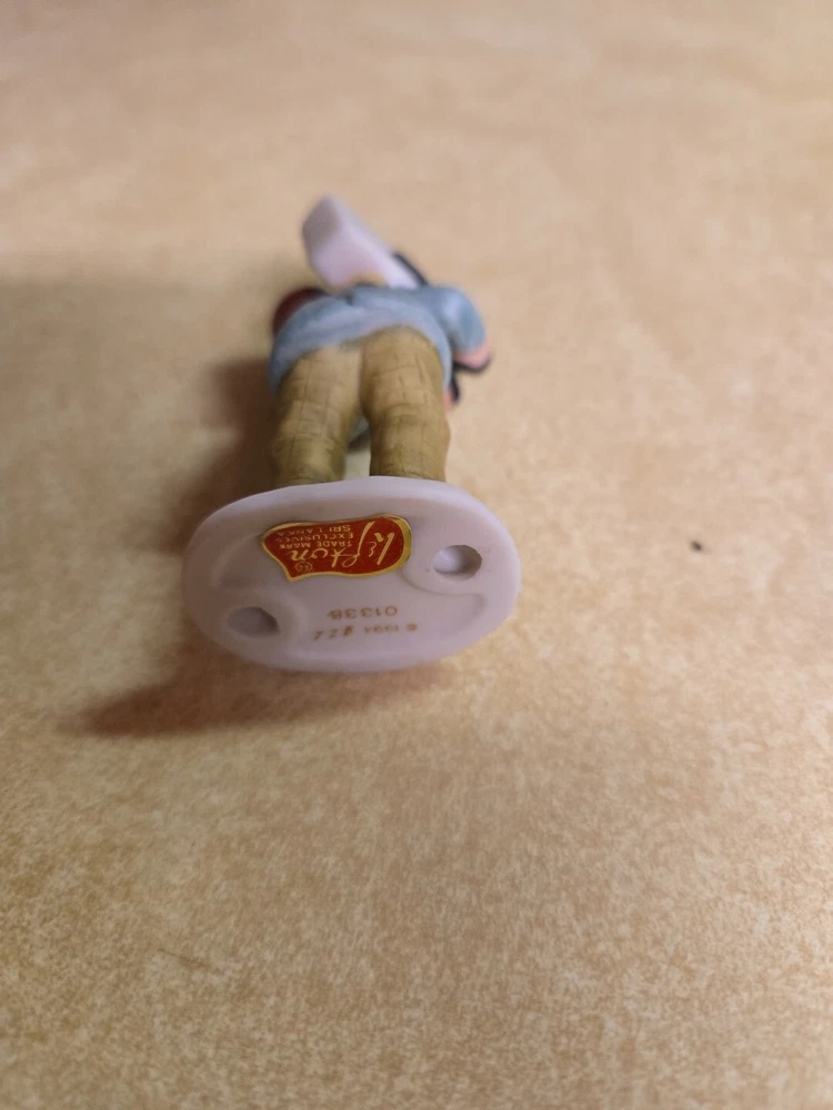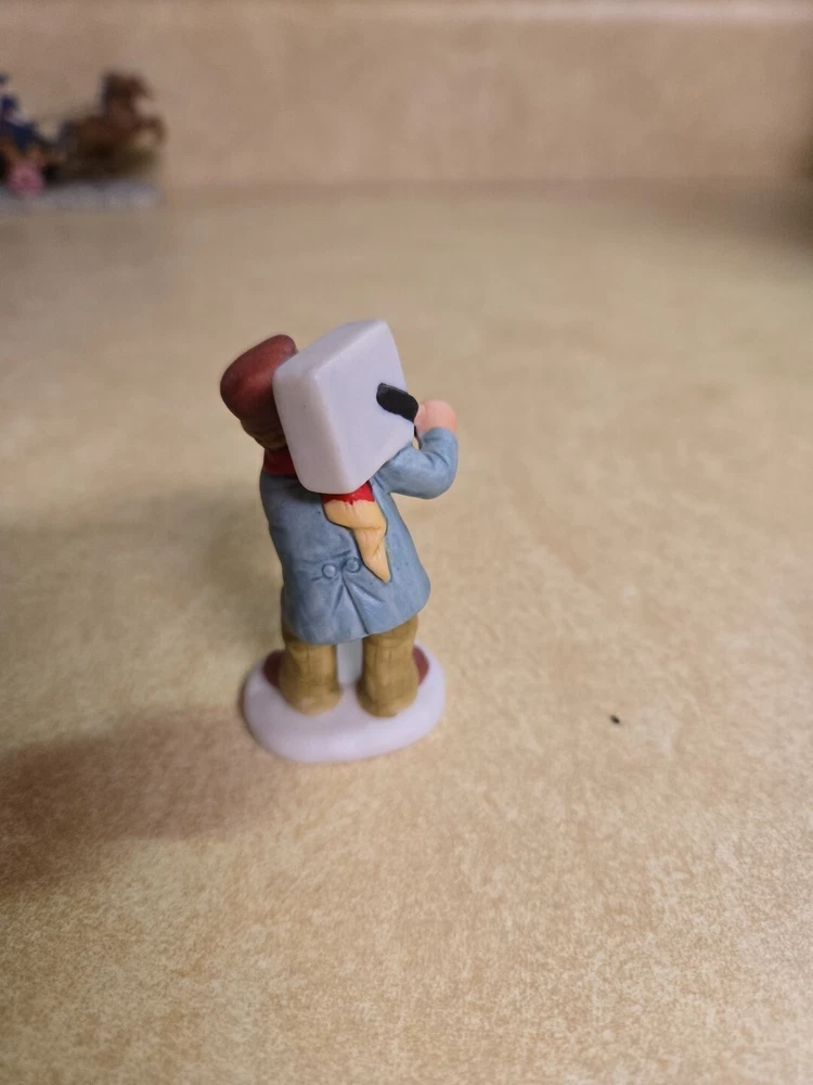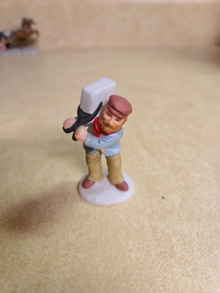 This is a Lefton Colonial Village 1994 Christmas figurine featuring Sean O'Doul, the Ice Maker. The figurine is made of ceramic and porcelain, hand-painted in a multicolor Colonial style. It is part of the Snow Village collection and suitable for a Christmas village display. Measuring 1 x 1 x 2 3/4 inches, this collectible figurine adds charm to any Christmas scene. Perfect condition