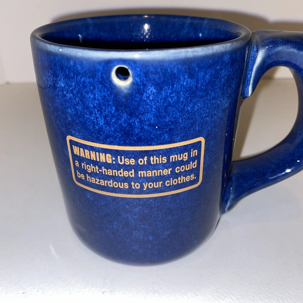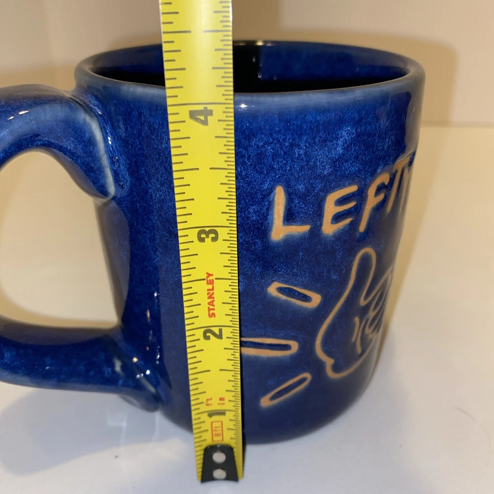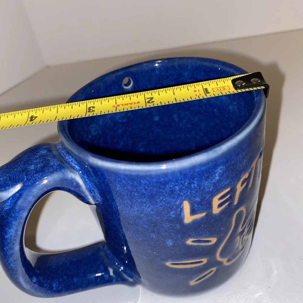 Lefty’s Left Handed Pottery Coffee Mug Cup Novelty Prank Hole Blue Drip Glaze