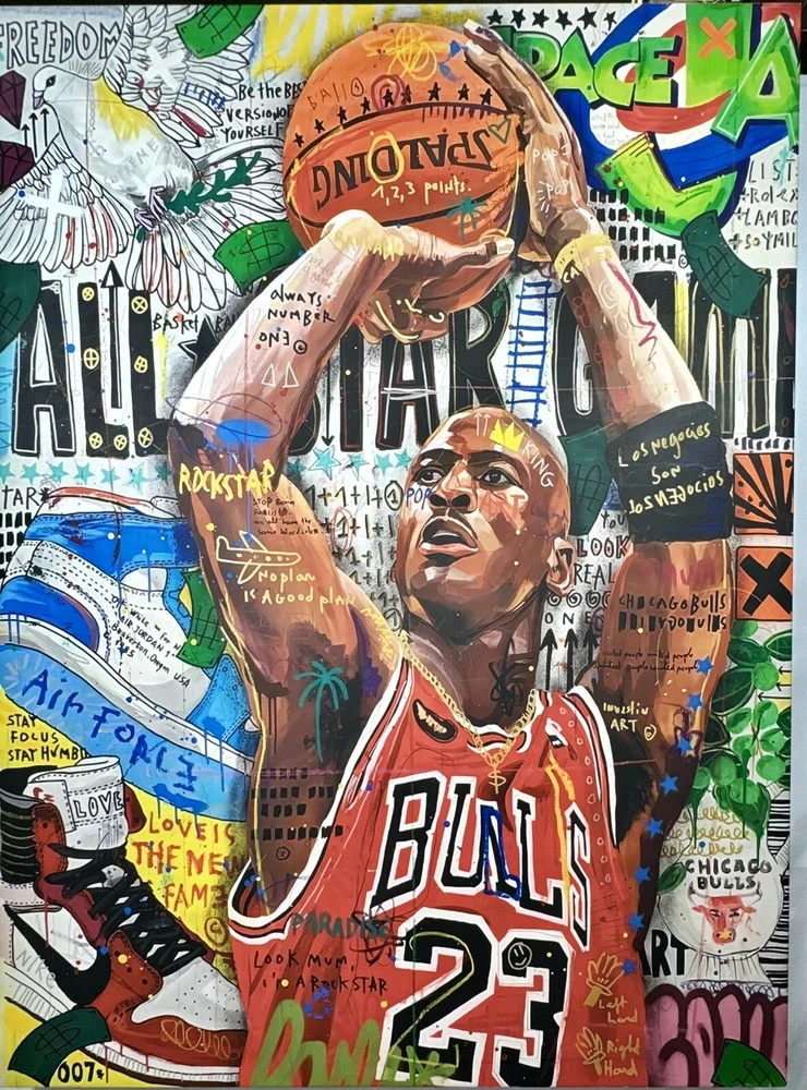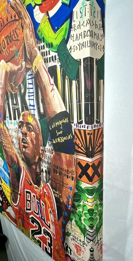 Bring home the legendary Michael Jordan with this stunning Modern Art canvas print. Measuring 28x37 inches, this licensed reprint is framed and matted, making it the perfect addition to any art collection. The portrait style print features a vibrant multi-color design, with elements of street art and pop art that truly captures the essence of the basketball legend. This canvas print is produced using high-quality canvas printing techniques, and comes with a mounting kit and certified wood. The item is a single piece, and is not personalized or signed. It's a must-have for any fan of modern art, movies, or street art. Hang it in your home or office today!