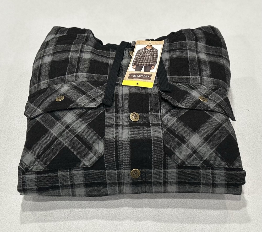 Legendary Outfitters Men's Cotton Flannel Hooded Shirt Jacket Size: Small Color: Black Content: Shell: 100% Cotton Hood: 60% Cotton / 40% Polyester Lining: 100% Polyester
