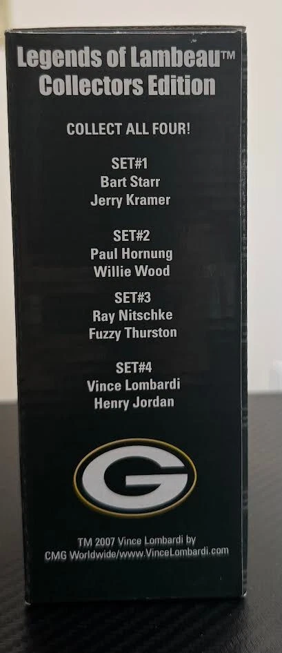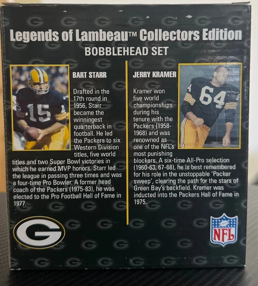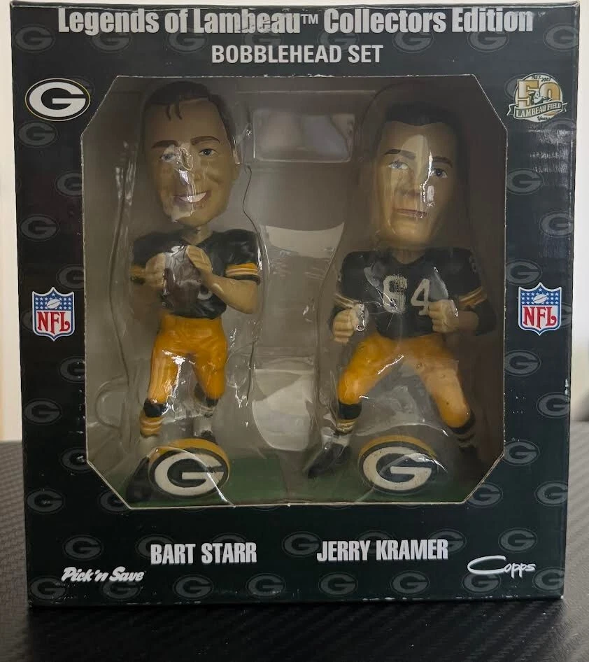 Celebrate your Green Bay Packers fandom with the Legends of Lambeau Bart Starr / Jerry Kramer Collector’s Edition Bobble Heads. These iconic figurines pay tribute to the legendary quarterback and his storied career with the team, capturing the essence of football heritage in vibrant, detailed design. Perfect for display, they're a must-have for any serious collector or die-hard Packers enthusiast.Crafted in 2007, these bobble heads are a vintage piece that embodies the spirit of the game and the storied NFL franchise. Whether they're gracing a shelf or adding to a growing collection, they're a timeless reminder of the greatness that is Bart Starr and the enduring legacy of the Green Bay Packers.