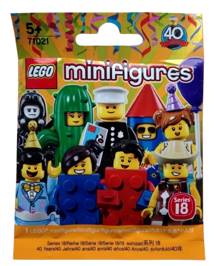 18 Each Lego Series 18 Minifigure 71021 is brand new factory sealed in its original foil pack complete with accessories, display plate, and collector's leaflet. The complete set is available here . Orders are securely packaged in boxes and ship same day by 4 pm est. Shipping is combined at checkout and free for orders $25 or more. Returns are free for 30 days. Questions will be responded to within one day. Sealed packs will arrive in the exact packing list order for easy identification. Product Details: Bring exciting new play possibilities to existing LEGO sets with the celebratory LEGO Minifigures 71021 Party series. This festive series of fun collectibles comes with an array of new-for-April-2018 costumes and accessories, including a balloon on a string, a cute little mouse and a surprise party cake, and features a host of brightly dressed characters, all ready to party. 1978 Police Officer with LEGO set 600 Police Car (first ever Lego minifigure replica) Birthday Party Boy with a present, balloon and card Birthday Party Girl with a present, balloon and party hat Cactus Girl with cactus costume Cake Guy with a large cake Cat Costume Girl with a fish Cowboy Costume Guy with a horse costume Dragon Suit Guy with head gear, tail and wings Elephant Costume Girl with a mouse Firework Guy with a firework suit Flowerpot Girl with a pot and flower hat LEGO Brick Suit Girl with a red brick LEGO Brick Suit Guy with a blue brick Party Clown with 2 balloon animals Race Car Guy with race car costume Spider Suit Boy with spider Unicorn Guy with unicorn head, horse tail, sword and shield Lego's collectible minifigures are a fast growing hobby that allows fans of all ages to collect, build, play, gift, and invest! Minifigures specializes in authentic factory sealed Lego cmf's, poly bags, and box sets. Browse over 850 minifigures from all 55 official cmf series: New for 2025 - PreOrder Series 27 Minifigures Today! Series 1 | 2 | 3 | 4 | 5 | 6 | 7 | 8 | 9 | 10 | 11 | 12 | 13 | 14 | 15 | 16 | 17 | 18 | 19 | 20 | 21 | 22 | 23 | 24 | 25 | 26 | 27 D&D | Disney | Super Mario | Marvel | DC Comics | Looney Tunes | Muppets | Lego Movie | Batman | Simpsons | Harry Potter | Ninjago | Bandmates | DFB | Team GB | Unikitty