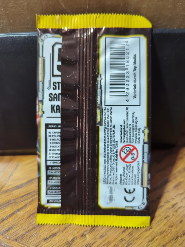 This is a sealed trading card pack from the LEGO Star Wars Series 1 collection. The pack contains 5 non-sport trading cards manufactured by LEGO. The cards feature characters and scenes from the Star Wars franchise in Lego form.
