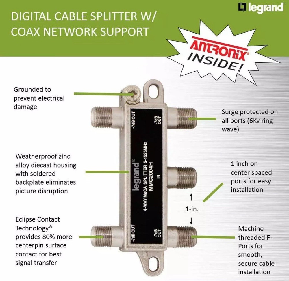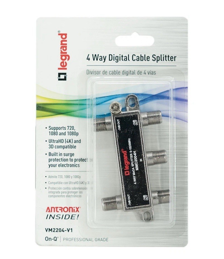The Legrand Onq 4 Way Cable Splitter is a reliable and efficient device designed for splitting coaxial cables in various settings such as home offices or theaters. With a sleek black color and compact size of 4 ways, it is lightweight at 0.18 pounds, making it easy to handle and install. The package dimensions of 5.94x3.86x0.79 inches ensure it is securely delivered to your location. Trust in the On-Q brand to provide a high-quality solution for your TV, video, and audio needs. InA2