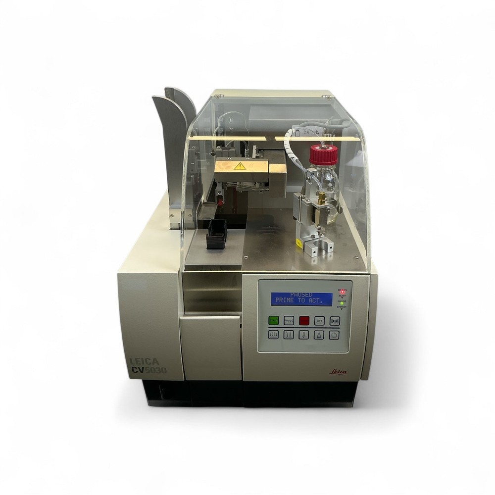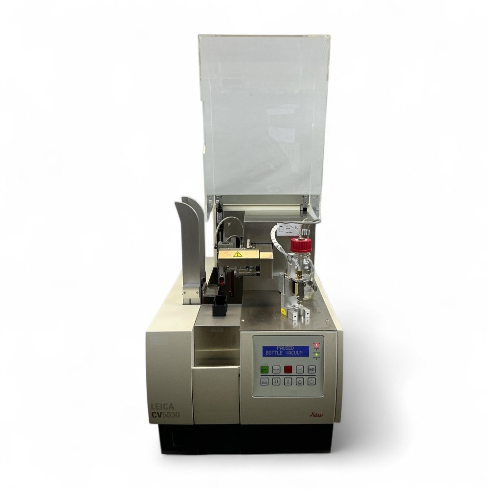 The Leica CV5030 is a fully automated glass coverslipper designed for high-throughput histology labs. It offers precise, consistent application of coverglass to stained slides using xylene-based mounting media. The system supports continuous loading of slide racks and accommodates a range of coverglass sizes, making it ideal for integration into routine pathology workflows. Key Specifications: Model: CV5030 Brand: Leica Function: Automated glass coverslipper Slide Capacity: Up to 400 slides/hour Coverglass Size: 24×40 to 24×60 mm Mounting Media: Xylene-based Automation: Fully automated operation Application: Histology, pathology labs Testing Notes: The unit powers on and off using the main power switch. However, the keypad power button is unresponsive and does not function. Listing and template services provided by inkFrog