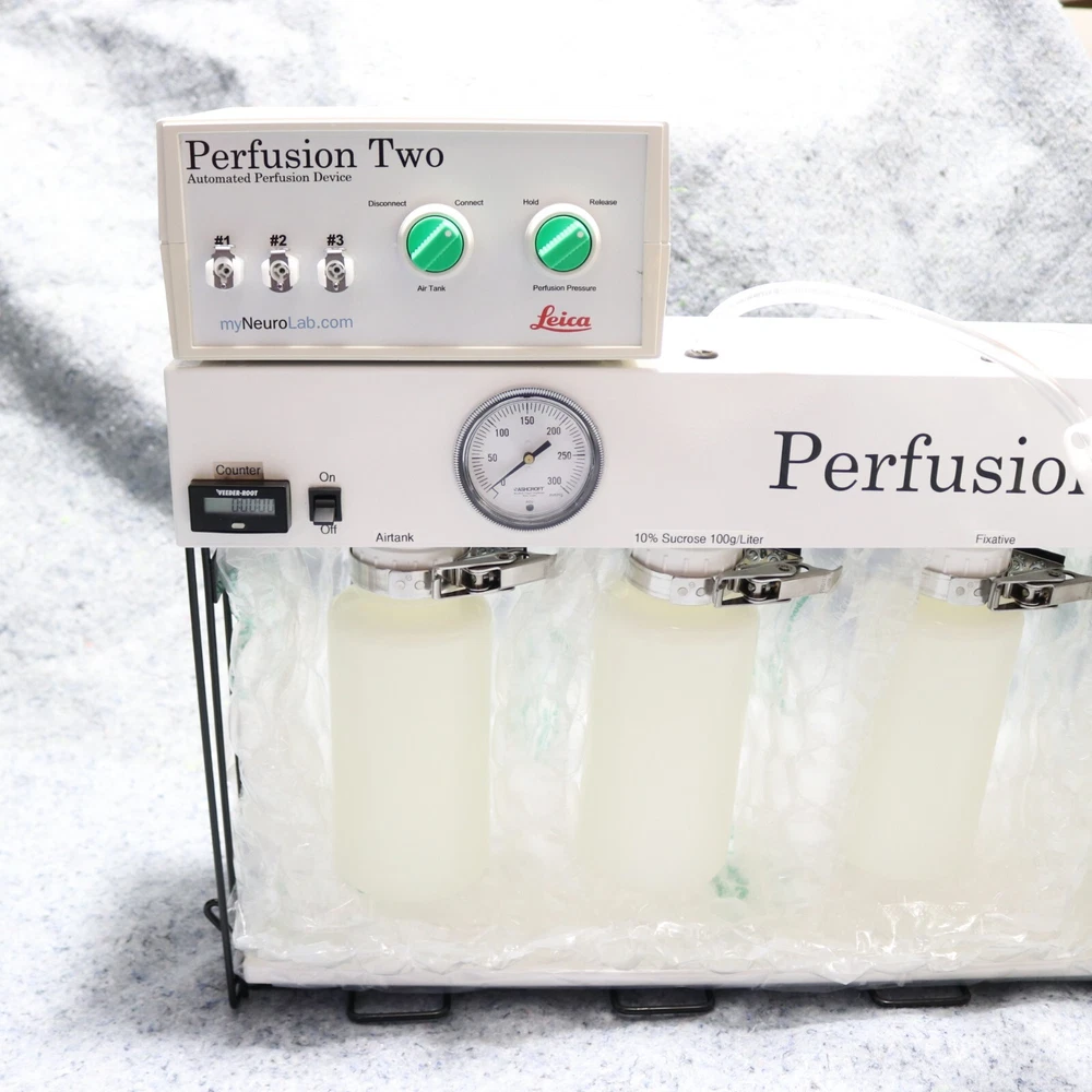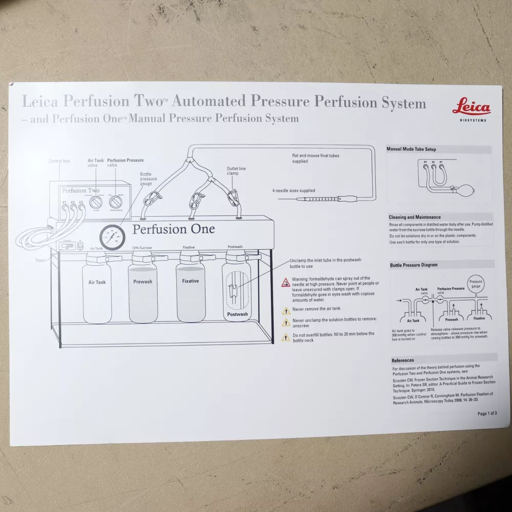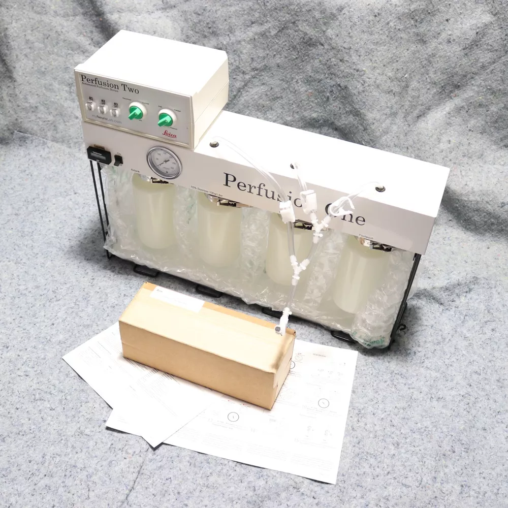 Leica Perfusion Two Automated Pressure Perfusion Instrument with Perfusion One Unit reported to be a surplus unit, box opened, looks to be brand new. Very difficult to find this unit at this price, order now before it is gone! This Perfusion two automated pressure perfusion system includes an automated air compressor that quietly pumps the air tank of the perfusion one up to 300 mm Hg and stops. Quicker fixation as pressure washout gets all blood cells out in about five seconds Better tissue quality Removing all red bloods cells reduces HRP background and autofluoroesence Avoid soft tissue shrinkage As each animal is being prepared, the pressure is set up to begin at the turn of a switch. Pressure above physiological pressure is required to clear all blood vessels and leave no red blood cells. This system gives much greater consistency and more reproducable perfusions. Glacier_Sales has been selling on eBay for over 10 years! We strive to ship your items quickly and safely. See our customer reviews to ensure buyer confidence. Order Now! Seller's Disclaimer: Regardless of the origin of the equipment, documentation provided or identification appearing upon the equipment, the equipment described and offered here is in no way certified for, recommended for, or offered for any specific use. The purchaser agrees that the seller shall not be held responsible or liable for any injuries, death or damages to persons or property, whether incidental or consequential, associated in any way with the equipment. The purchaser, by purchasing this item(s) or equipment, indicates their acknowledgment of, and agreement to the terms of this disclaimer. It is the purchaser's responsibility to have the item inspected and certified by a qualified professional before any use! For this item category, eBay requires the following statement / information. The item has been cleaned and handled in accordance with the manufacturer's instructions . Contact: Q & Q Resale, Oakdale, CA 12093225443. The sale of this item may be subject to regulation by the U.S. Food and Drug Administration and state and local regulatory agencies. If so, do not bid on this item unless you are an authorized purchaser. If the item is subject to FDA regulation, I will verify your status as an authorized purchaser of this item before shipping of the item."
