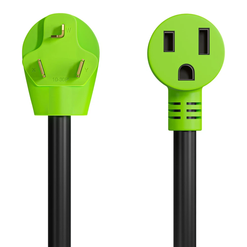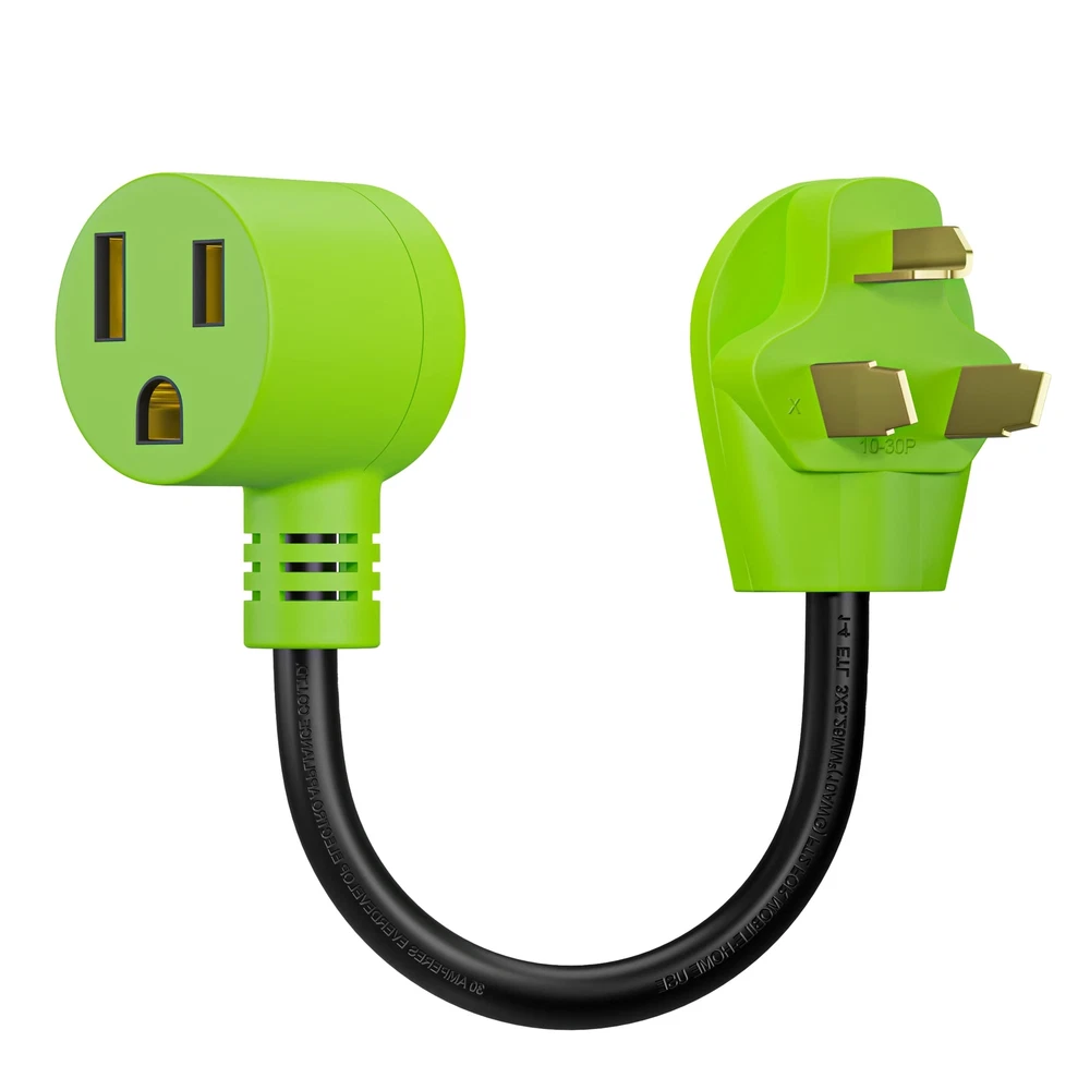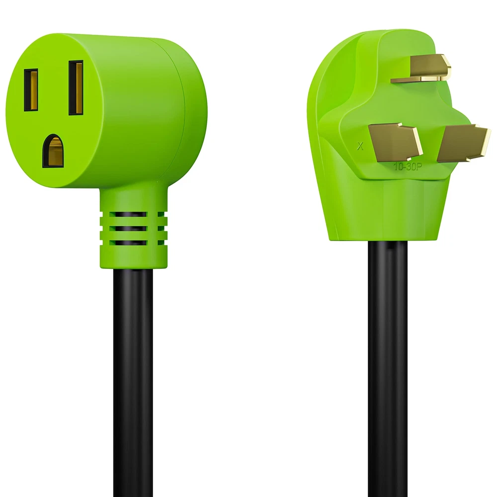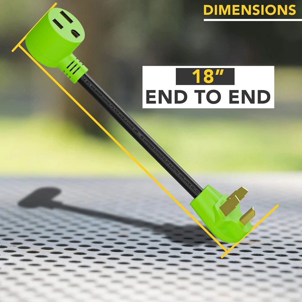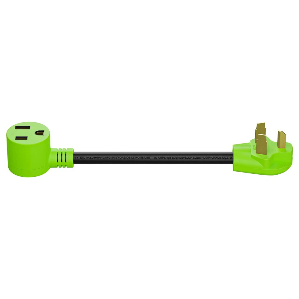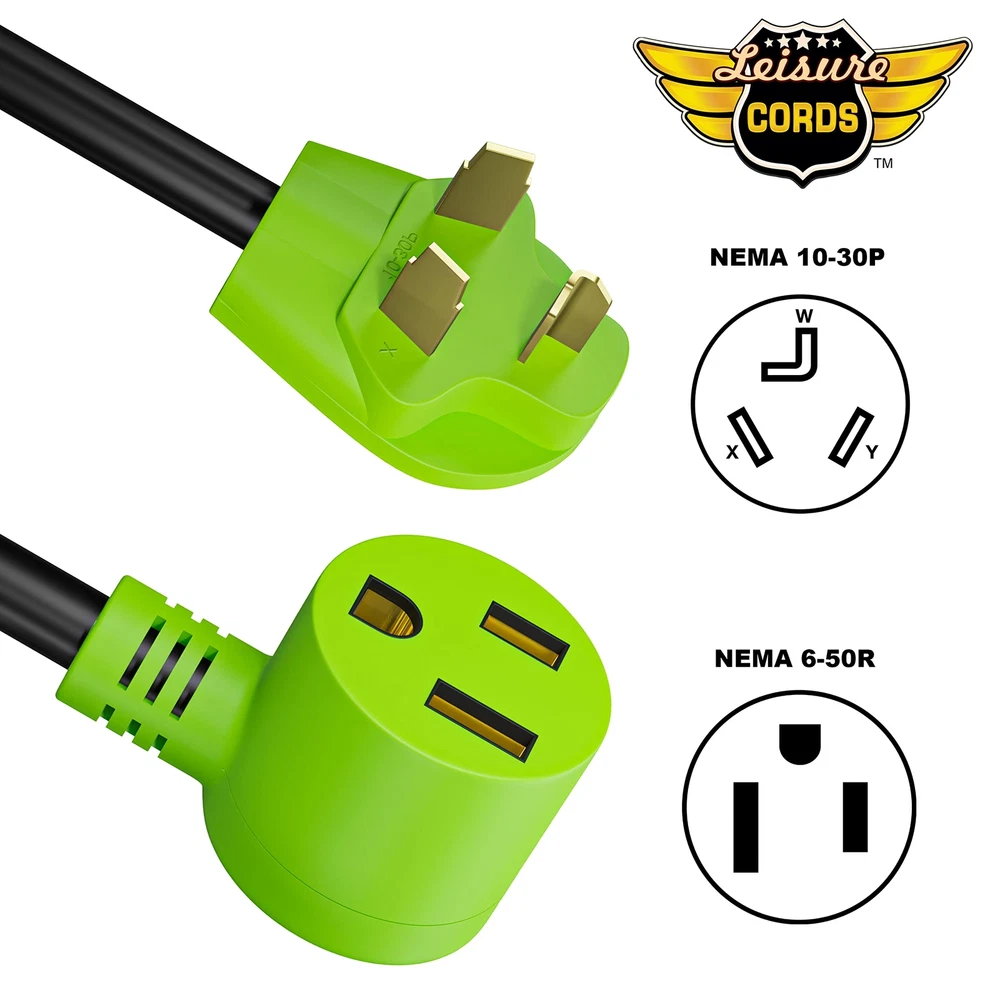 Leisure Cords Electrical Rating: 30A (NEMA 10-30P) male to 50A (NEMA 6-50R) female adapter cord. Rated for 250V. High Quality: Connector is 10 AWG x 3C all-copper wires, STW Jacket with features excellent abrasion. Application: Allows you to simply convert the power with RV or generator socket to fit for your welder Superior Durability: Molded and made of 100% pure copper wiring coated with a heavy duty flame retardant, UV-resistant polyvinyl plastic sleeve that serves as protection from outdoor elements, wear and tear. Both plug are right angle, 90 degree bent design, 50 Amp, 250V, 18 Inch.