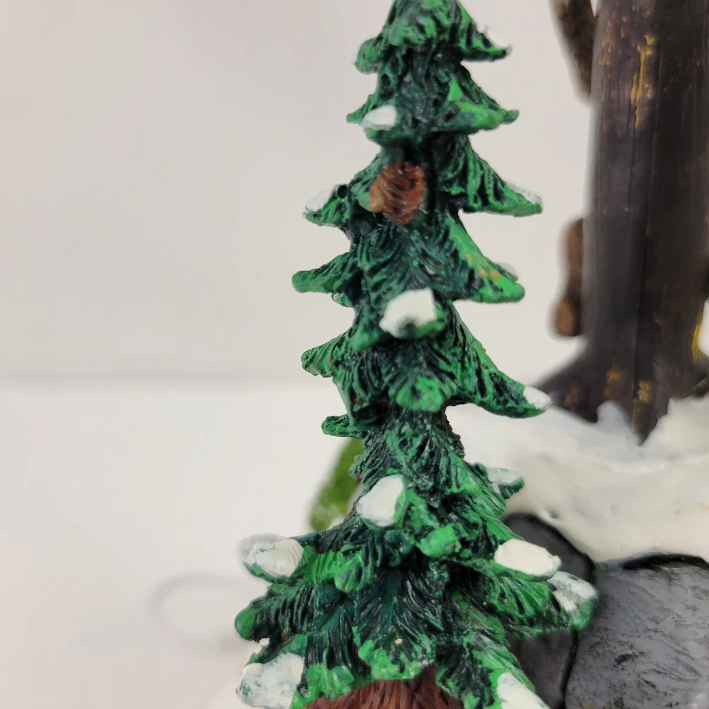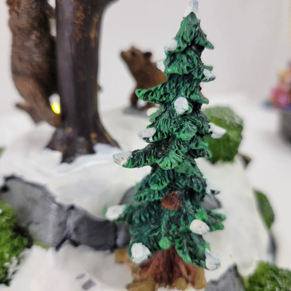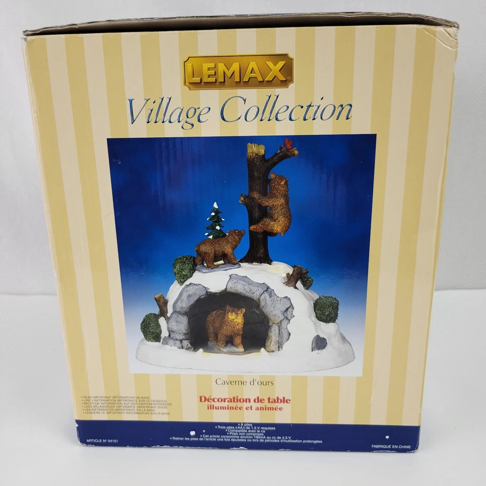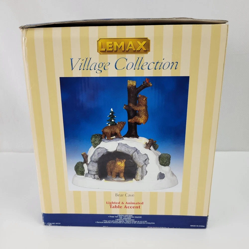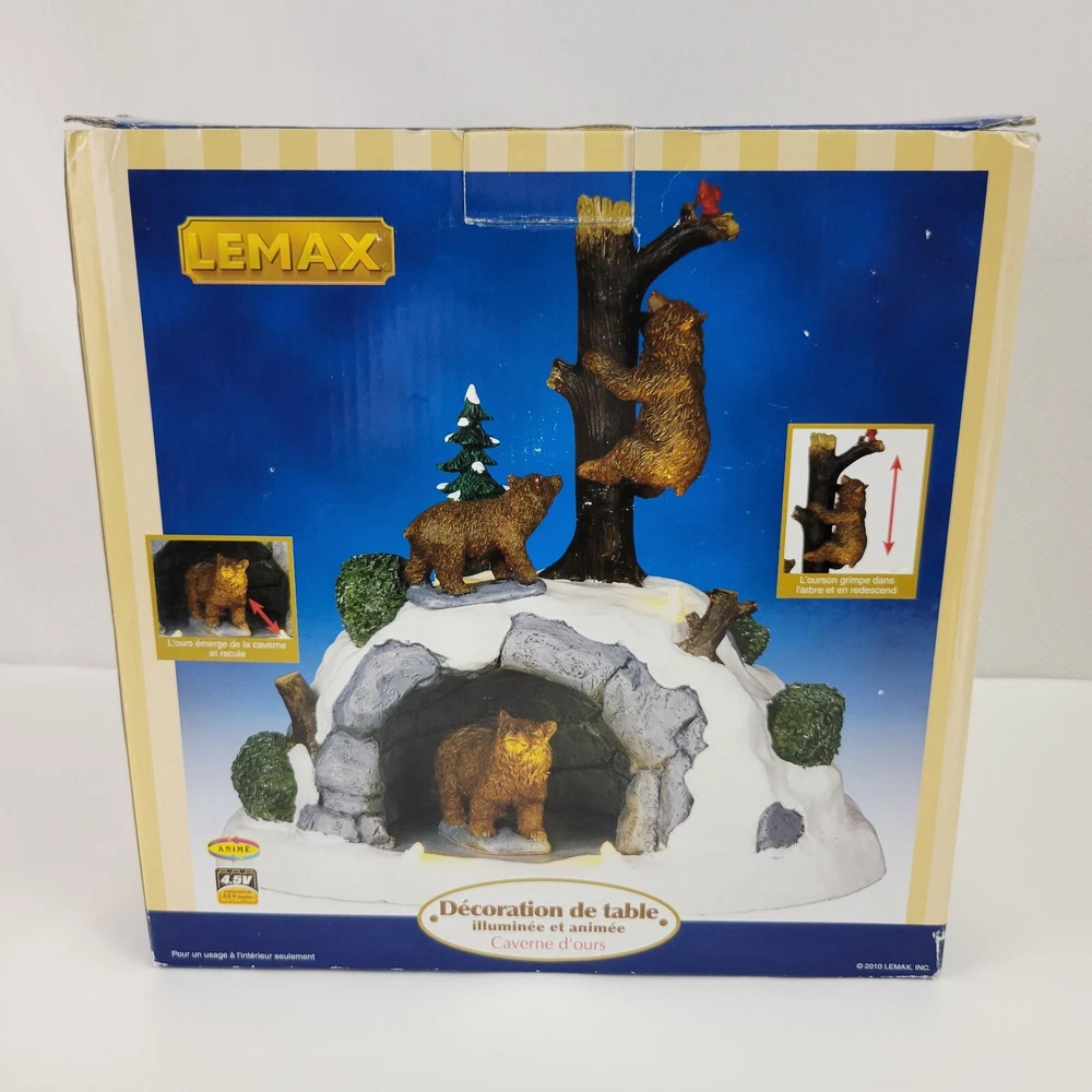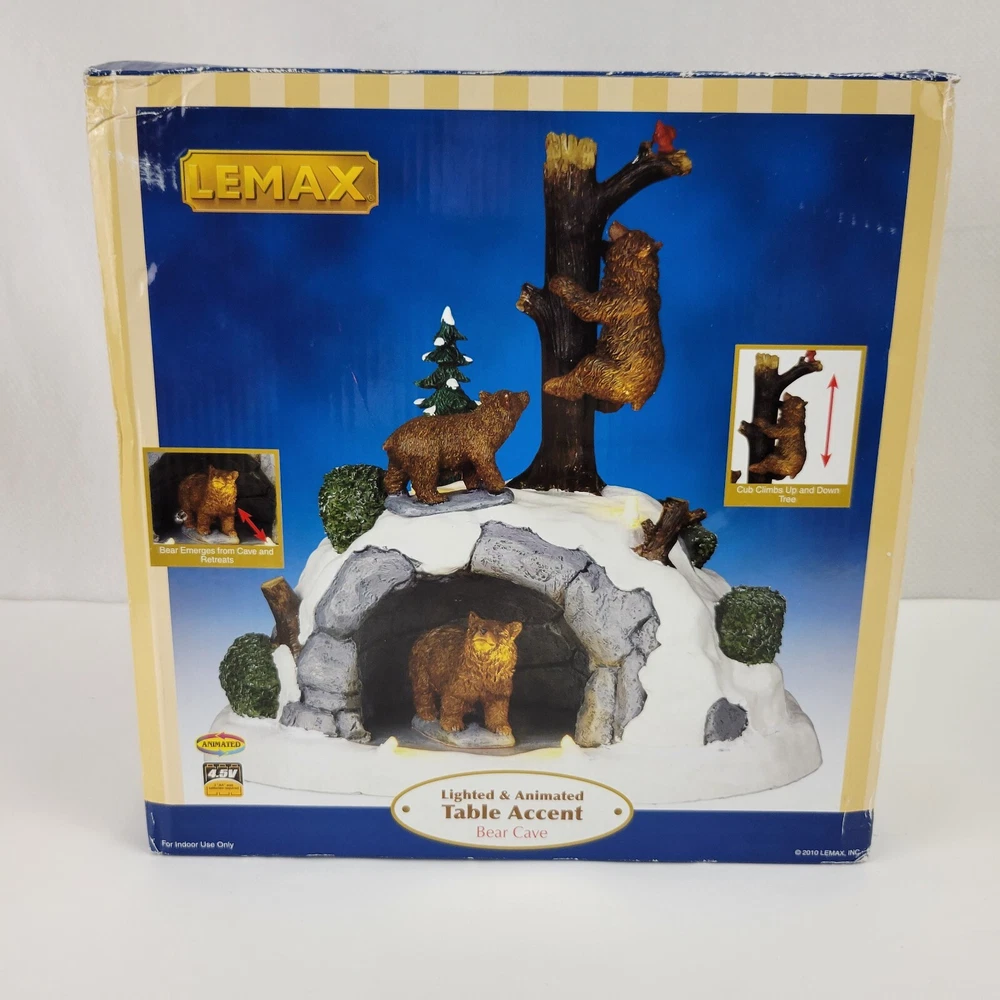 This is a very hard to find retired Lemax lighted and animated Bear Cave. The lights and the two bears move as expected. There do appear to be some missing branches on the pine tree in the background, but otherwise there don't appear to be any chips. There is some discoloration around the base, so please take a close look at the pictures for details. The cave comes in the original foam insert (with strap) and the box. The box has a fair amount of edging and dents so please take a look at those pictures. Included in the box is a battery power box to run the lights and animation. It requires 3 AA batteries (not included.)