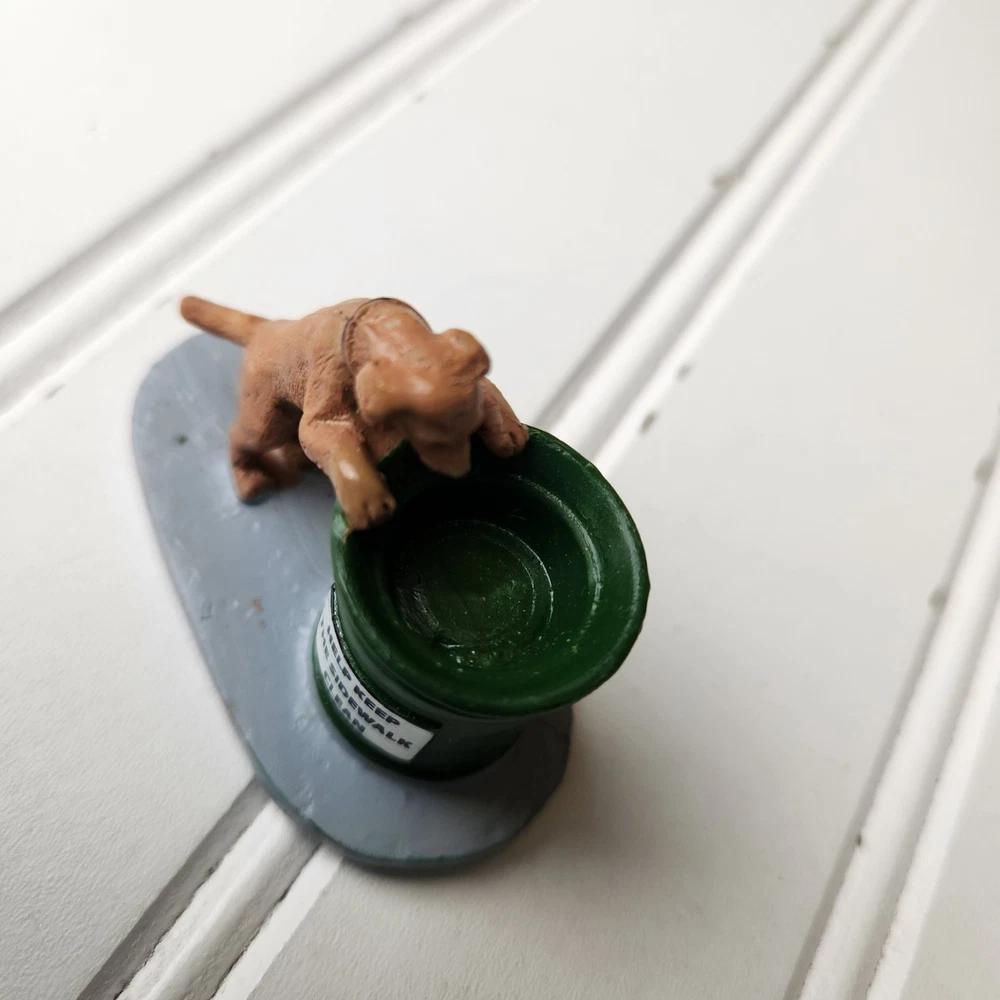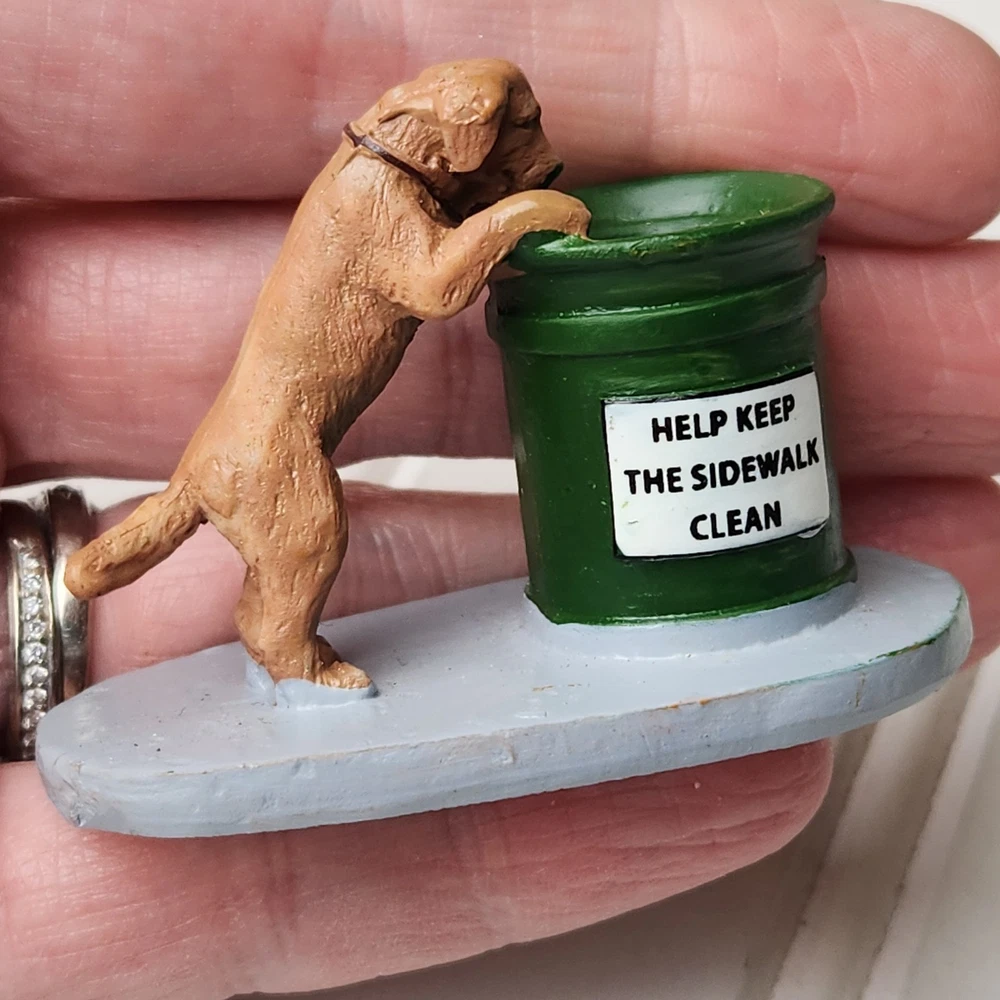 The Lemax Christmas Village #14364 Dog Help Keep Sidewalk Clean figurine is a hand-painted, miniature accessory designed to be placed in any room during the holiday season. This collectible piece features a dog theme, showcasing a puppy helping to keep the village town clean. Made of polyresin, plastic, and metal, this American-style figurine is a part of the Lemax General Products collection and is suitable for display on a wreath, mantel, end table, foyer table, furniture, kitchen cabinets, or dining table. Perfect for adding a festive touch to your holiday decor, this Lemax figurine is a charming addition to any Christmas village display. Dog only missing sign. Good pre-owned condition