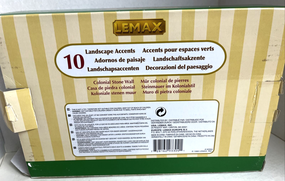 Number in Pack:10Department:AdultsFeatures:Boxed, Multi-PartRoom:Any RoomEra:Late 20th Century (1970-1999)Seller Notes:“Great condition, comes with box”gtin13:728162933041Occasion:ChristmasSuitable For:Christmas VillageStyle:ColonialType:Christmas VillageCharacter Family:Colonial Stone WallMaterial:ResinSubject:LandscapePackaging:BoxUPC:728162933041Theme:SeasonalYear Manufactured:1999Brand:LemaxTime Period Manufactured:1990-1999Collection:LEMAX