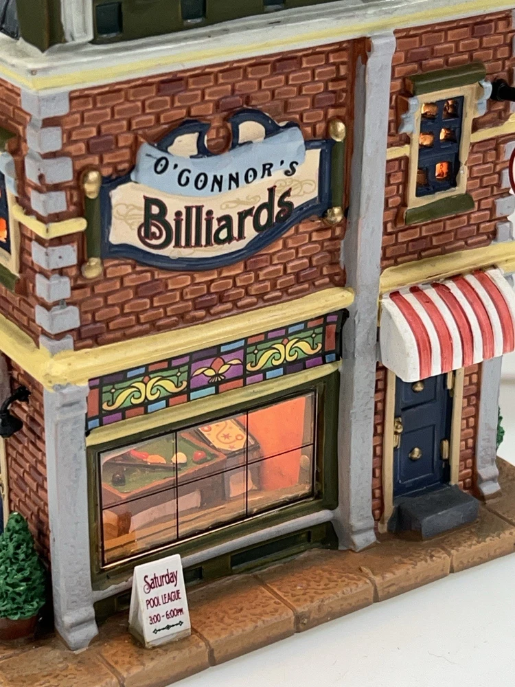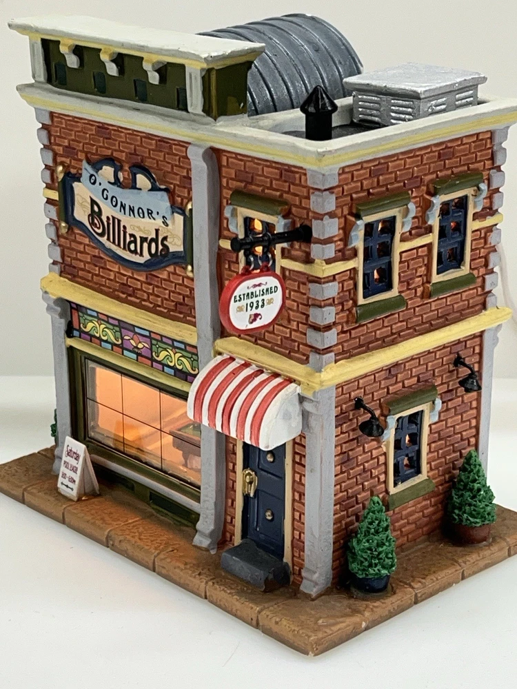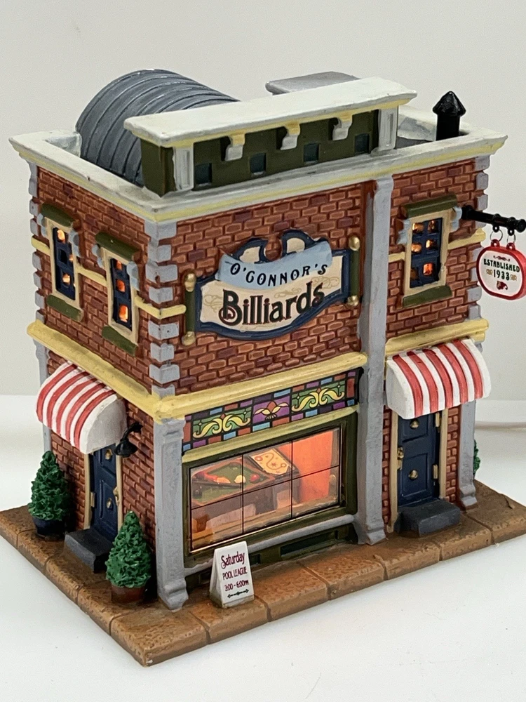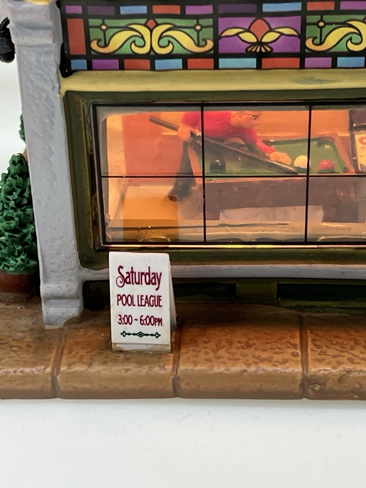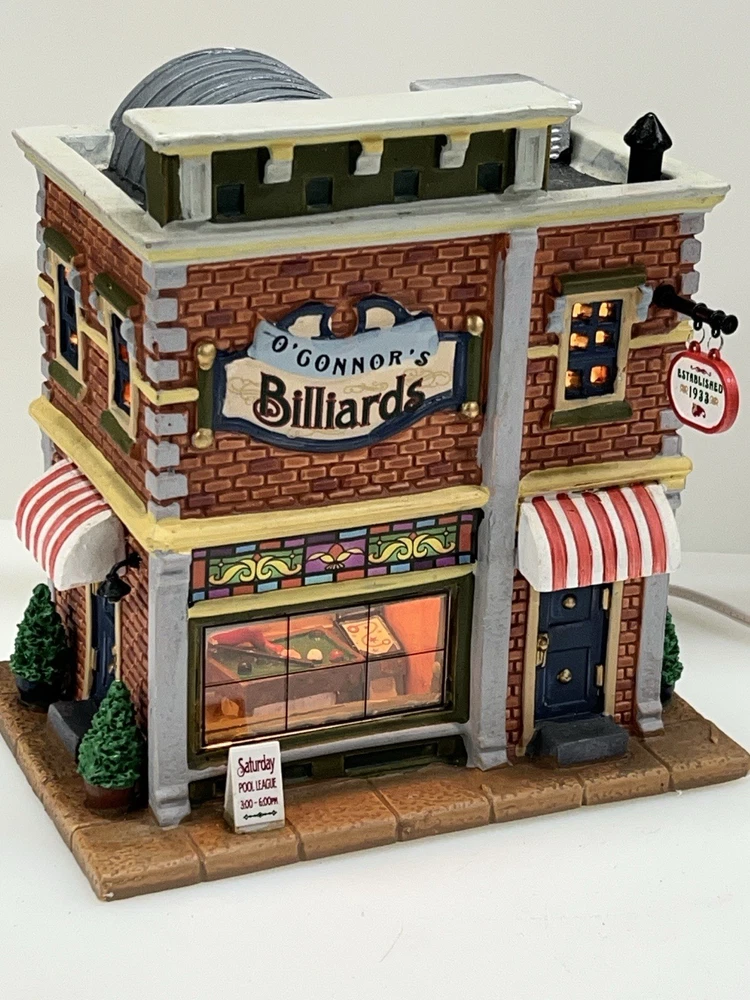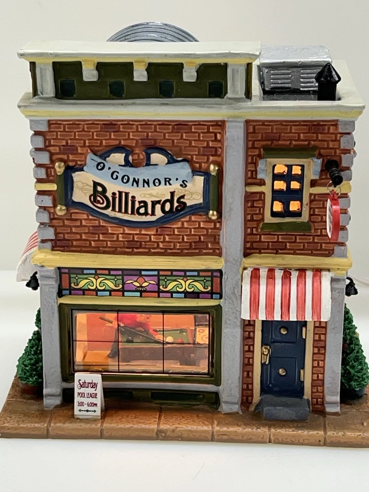 Add a touch of whimsy to your holiday display with this charming Lemax O’Connors Billiards piece from the 2012 collection. This asymmetrical, medium-sized porcelain house is beautifully painted with a delightful Billiards Hall pattern, complete with colorful characters and a festive atmosphere. The house measures 7 inches in length, 6-3/4 inches in height, and 5 inches in width, making it perfect for any room or village display. This original, retired piece is part of the Lemax O’Connor's Billiards collection and features a light and sign that add to the overall charm of the house. The house is suitable for all occasions and is perfect for adults who love American-style decorations. Don't miss out on the chance to add this unique and rare piece to your collection. Absolutely incredible condition. Includes all original packaging including light & cord . Just a beautiful piece .