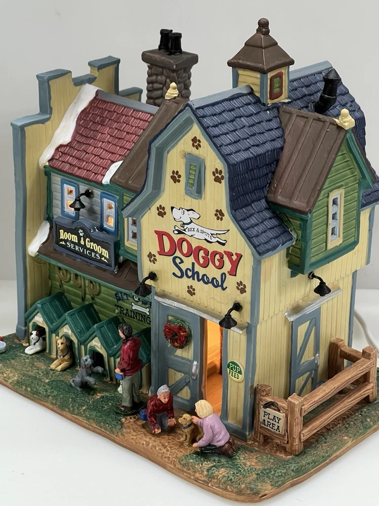 This rare and retired Lemax Christmas Village piece from 2016 features the whimsical "Rex and Spot Doggy School" pattern, perfect for any room and suitable for a village display. The medium-sized porcelain building measures 8 inches in length and height, and 6 inches in width, with intricate details and multicolor design. The item is an original and authentic Lemax product, part of the Carillon Decorative Products collection, and manufactured in China. It would make a great addition to any collection or a thoughtful gift for dog lovers. Absolutely incredible detail ! Pristine condition! RARE! Comes with all original packaging including cord & light .